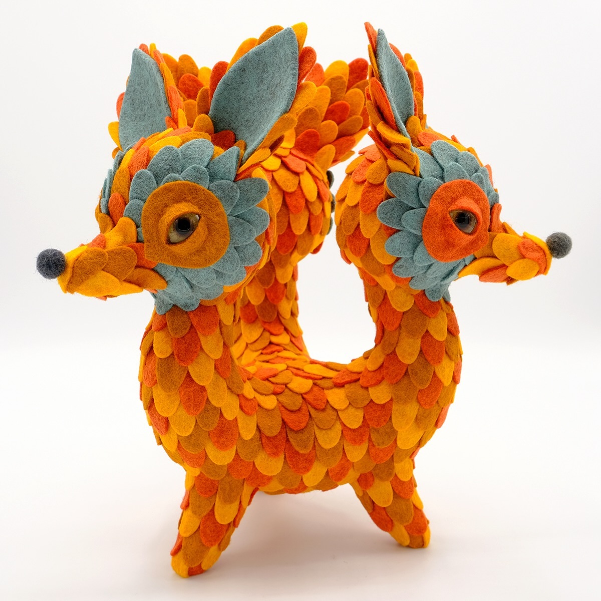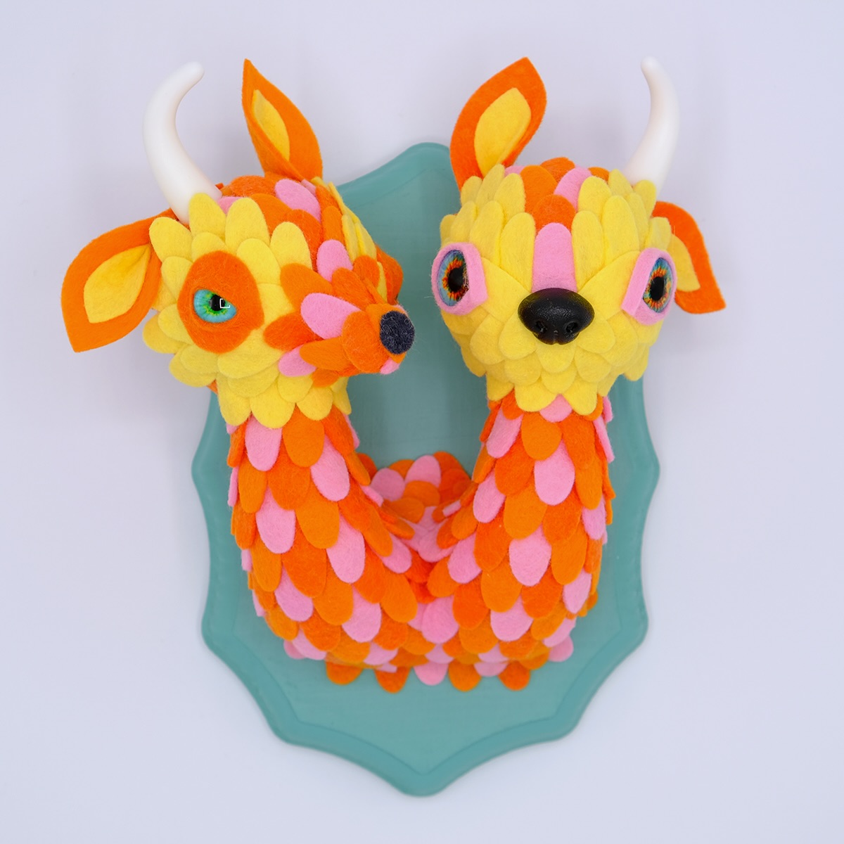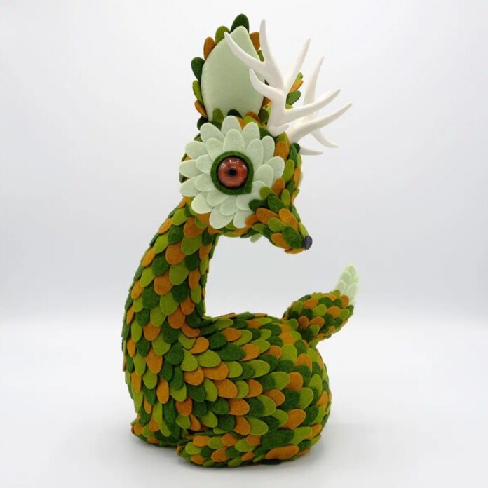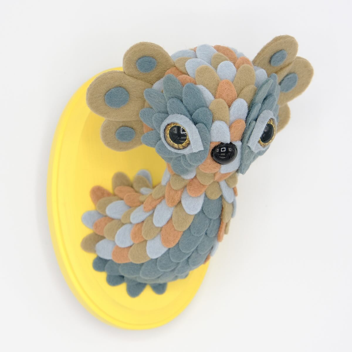Jordan Perme and Christopher Lees of Horrible Adorables craft fiber sculptures that reimagine natural history through a kaleidoscopic lens. Their hand-stitched creatures — part taxidermy, part plush toy, part mythological hybrid — burst with vibrant colors and exaggerated features, turning traditional wildlife displays into playful speculative biology. Each piece begins with needle-felted wool, built up layer by layer into fantastical forms that seem equally likely to inhabit children’s stories or surrealist dioramas. The duo’s meticulous craftsmanship elevates humble materials into astonishingly detailed creations, complete with glass eyes that gleam with uncanny life.