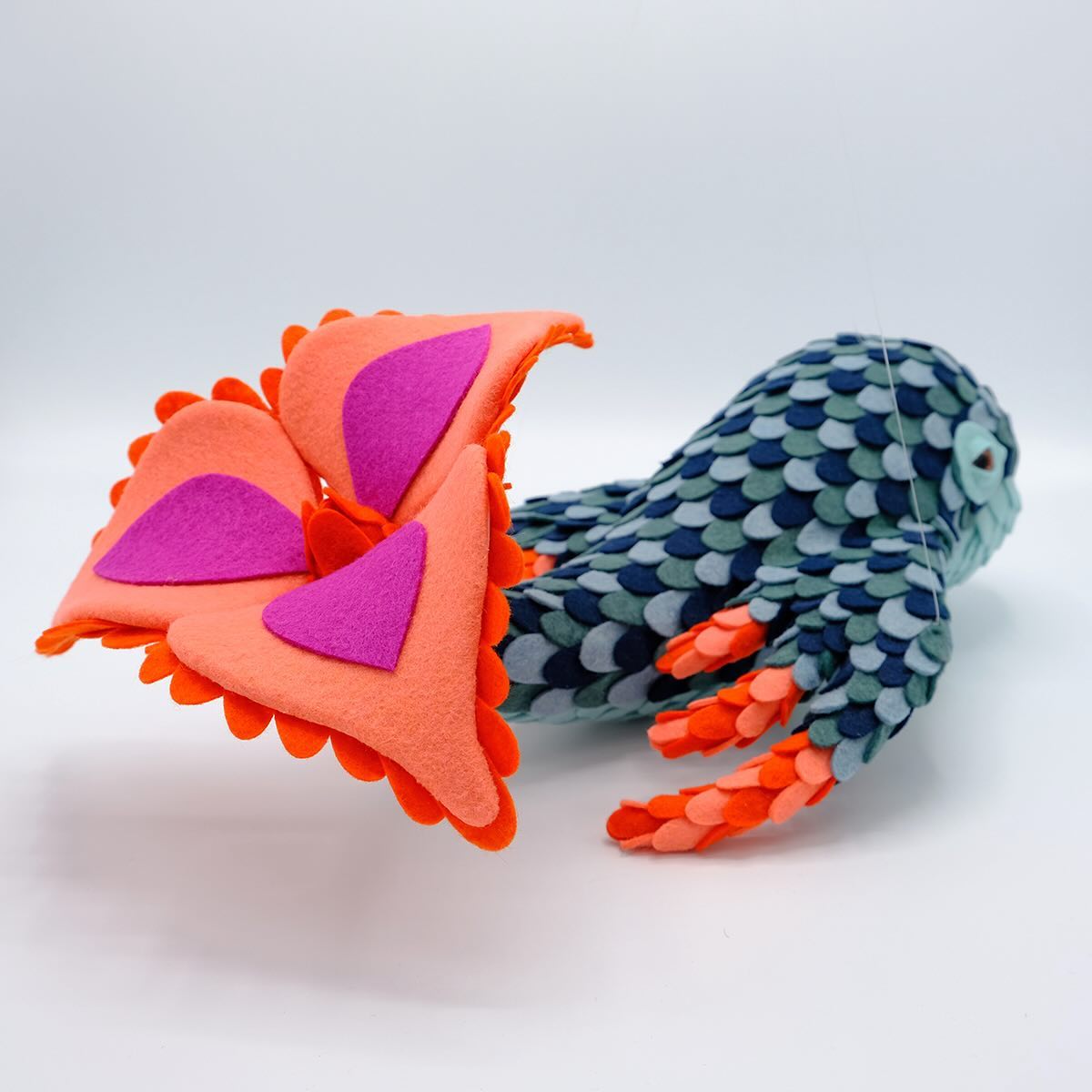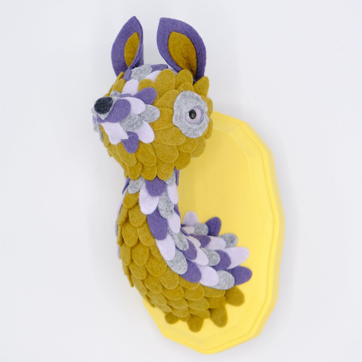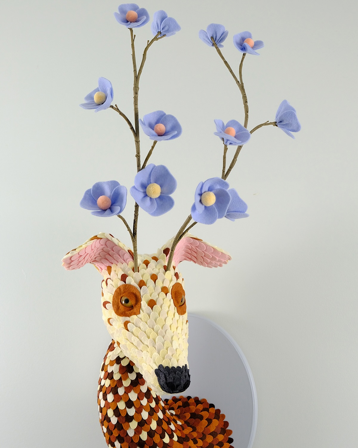 Jordan Perme and Christopher Lees of Horrible Adorables craft fiber sculptures that reimagine natural history through a kaleidoscopic lens. Their hand-stitched creatures — part taxidermy, part plush toy, part mythological hybrid — burst with vibrant colors and exaggerated features, turning traditional wildlife displays into playful speculative biology. Each piece begins with needle-felted wool, built up layer by layer into fantastical forms that seem equally likely to inhabit children’s stories or surrealist dioramas. The duo’s meticulous craftsmanship elevates humble materials into astonishingly detailed creations, complete with glass eyes that gleam with uncanny life.