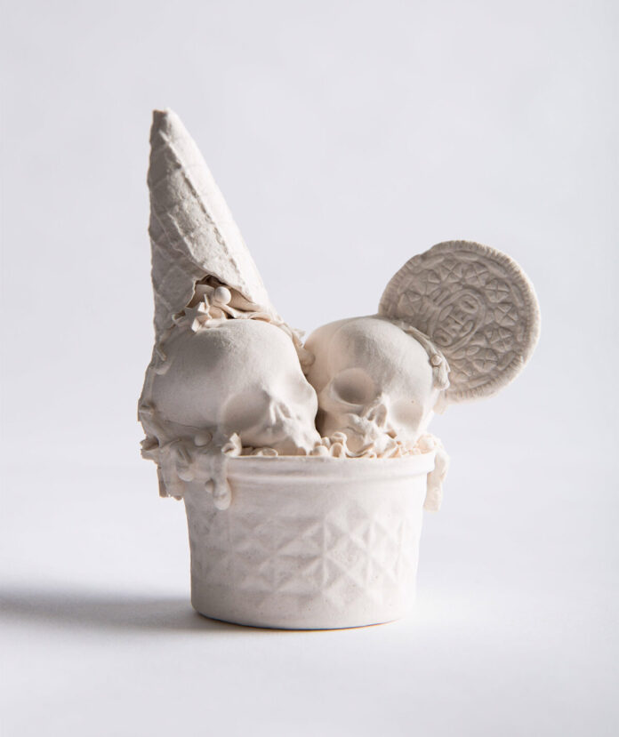 In the intricate world of Jacqueline Tse’s ceramic artistry, the series “Death by Sugar” captivates with its haunting fusion of indulgence and mortality. Her porcelain sculptures represent an uncanny marriage between the sweet allure of candy and the somber symbolism of human skulls. Crafted with meticulous precision using techniques like slip casting and slip piping, Tse’s creations challenge our perceptions by embodying the fragile line between temptation and transience. These works evoke a peculiar charm, luring us into a surreal realm where the boundless appetites of consumer culture are laid bare, capturing both the beauty and pathology of modern existence. The American artist from Tucson breathes life into her clay, metal, and wax art, which communicates the pervasive anxieties of urban life with an unsettling yet arresting sweetness.