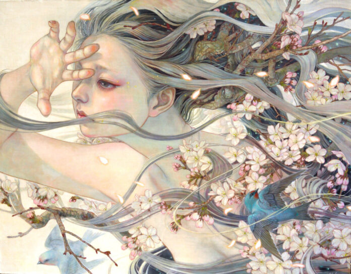 Miho Hirano’s artistry is a mesmerizing fusion of the ethereal and the natural, weaving introspective female figures with the enchanting motifs of flora and fauna. Her canvases are a delicate homage to both the silent articulations of nature and the quiet musings of the human soul. Through her brushstrokes, Hirano crafts a surreal narrative that blurs the boundaries between living elements and human form. Drawing inspiration from the wistful elegance of manga, she brings forth protagonists who are adorned not in conventional jewels but in the luxuriant tapestries of leaves, petals, and feathers. Her works are more than visual spectacles; they are contemplative meditations on the inherent beauty that lies just beneath the surface of everyday life.