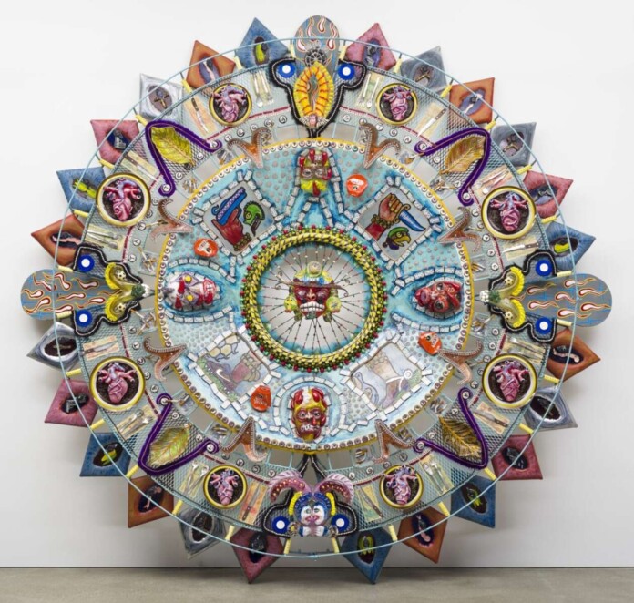 Einar and Jamex de la Torre’s monumental glass assemblages create a vivid and dynamic experience in their series ‘Collidoscope’. These mixed-media wall installations are a feast for the eyes, combining colorful mandalas with intricate details and strange creature faces. The brothers’ art reflects a unique blend of symbols, often incorporating hearts and references to immigrant experiences, Mexican-American culture, and their bicultural identity. Their work also draws on the rich iconography of Meso-American civilization symbols and religions, alongside elements of Christianism, creating a multifaceted narrative within each piece.
