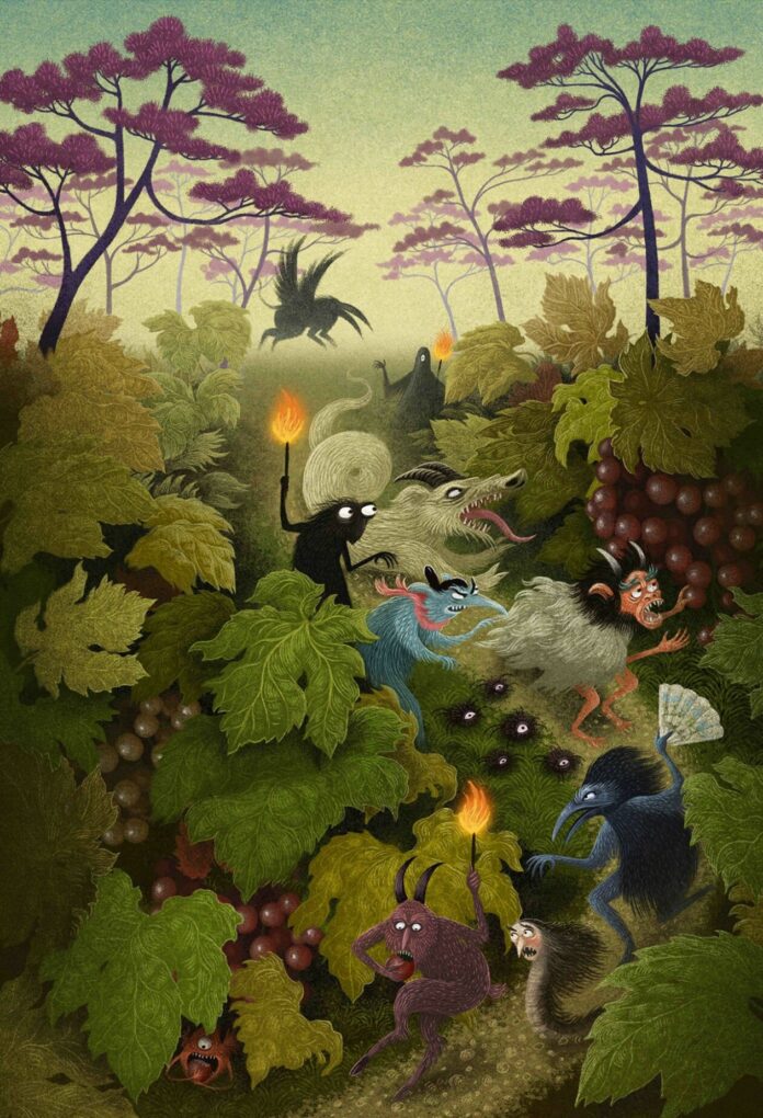 The illustrations serve as a bridge between the ancient and the modern, inviting readers to explore the multifaceted nature of storytelling. Whether it’s the stark silhouette of Death on a Pear Tree against the Benicadell mountain range or the intricate details of a bushman’s message in “A Message from a Hare”, Minor’s art captures the essence of each tale. His work is a testament to the enduring power of myths and fairy tales to inspire, teach, and resonate across generations.