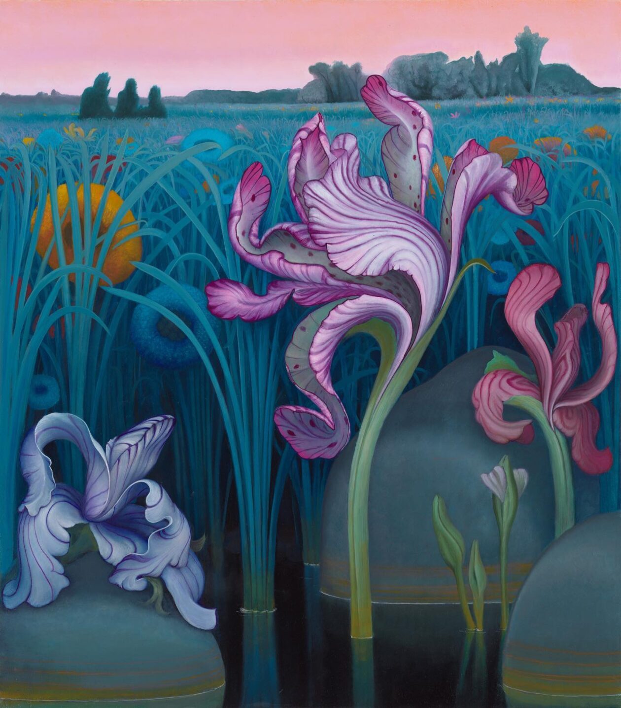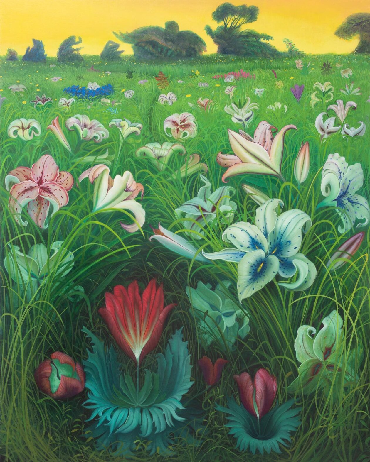 Dive into the lush, verdant worlds of Inka Essenhigh, where exuberant and otherworldly plants and flowers bloom in a symphony of vivid colors. Her painted visions are far more than mere depictions; they’re rich, distorted fables, where nature itself takes on anthropomorphized forms, alongside sprites and archetypes. Essenhigh crafts these dream-like narratives purely from her imagination, sometimes translating a mental image, other times working more abstractly with hues and shapes to convey an experience—be it the serenity of early morning light, a captivating fragrance, or a landscape mirroring a particular state of mind. Each piece is a journey into a collective unconscious, where mischievous narratives playfully weave through every detailed landscape, building, and figure.