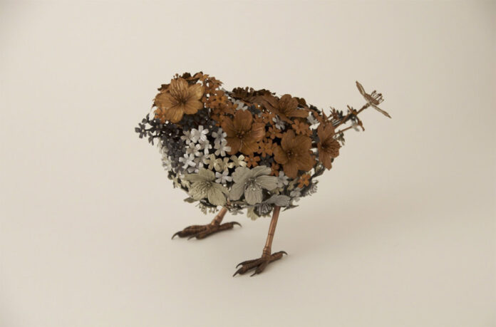 Taiichiro Yoshida, a masterful Japanese artist, transforms the delicate beauty of nature into stunning metallic sculptures. With a unique approach, he replaces the soft feathers and fur of animals with intricately sculpted metal flowers, crafting pieces that are both organic and beautifully engineered. His work is a harmonious blend of traditional metalworking techniques and contemporary artistry, resulting in creations that capture the essence of the animals while presenting them in a new, radiant form. Each sculpture begins with a plasticine base, upon which Yoshida meticulously adds phosphor bronze, copper, or silver blooms, symbolizing the enduring connection between flora and fauna.
