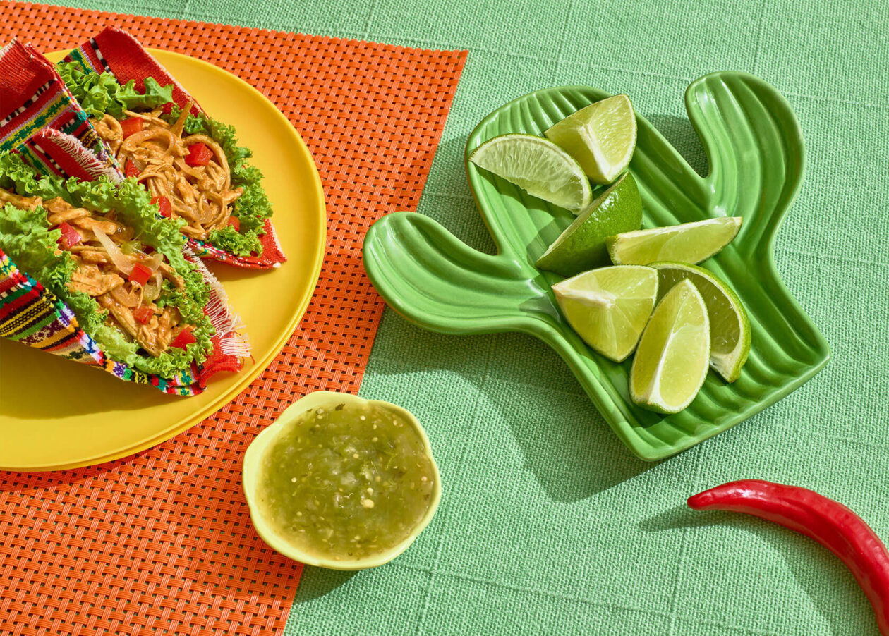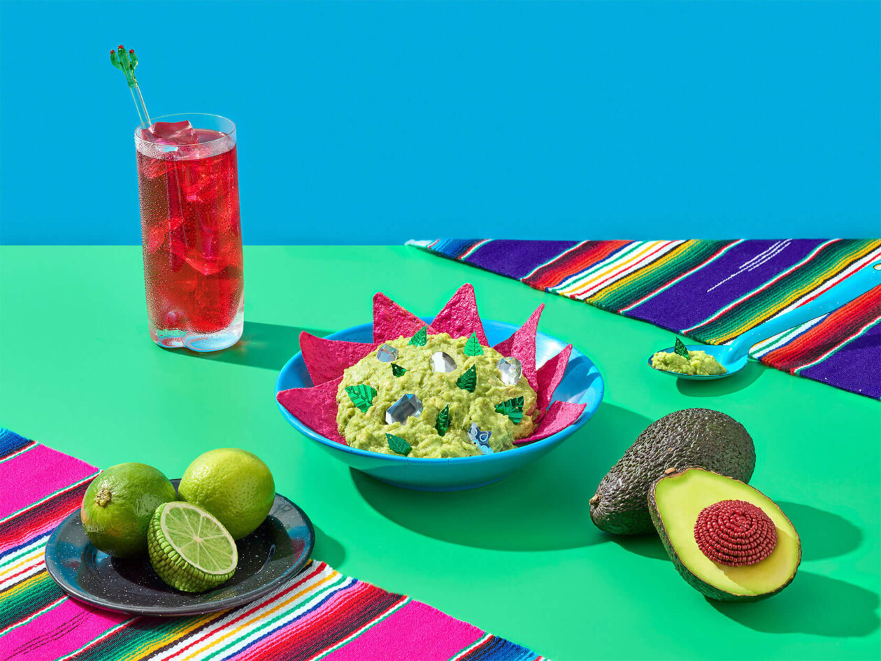 The images present a delightful fusion of Mexican food and handcrafted artistry. Dishes such as rose-hued quesadillas adorned with blossoms, a margarita crowned with cactus and shimmer, and guacamole accompanied by gem-encrusted avocados exemplify this creative synthesis. Rincón’s inventive spirit extends to fruit presented in a piñata style and the incorporation of Huichol beadwork into the display of colorful dishes, creating a feast for the senses.