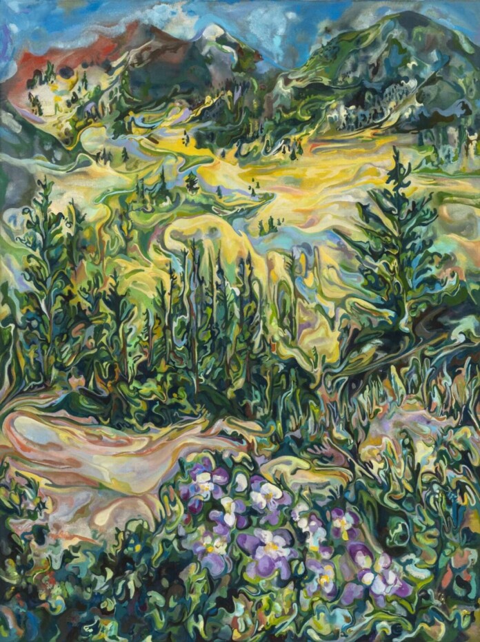 Calandra’s method, which she calls “automatic painting”, emphasizes fluidity and spontaneity. Using organic forms and bold brushstrokes, her work conveys an almost meditative stream of consciousness. Saturated colors dominate her canvases, creating dynamic contrasts that oscillate between realism and dream-like abstraction. These pieces are not merely landscapes but explorations of human connection to nature, each stroke of the brush reflecting a sense of wonder and transcendence.