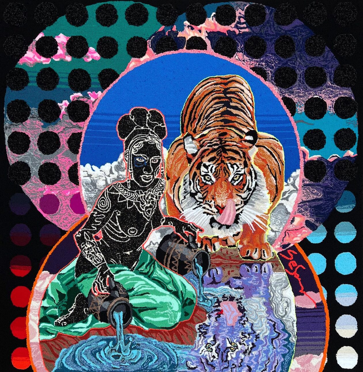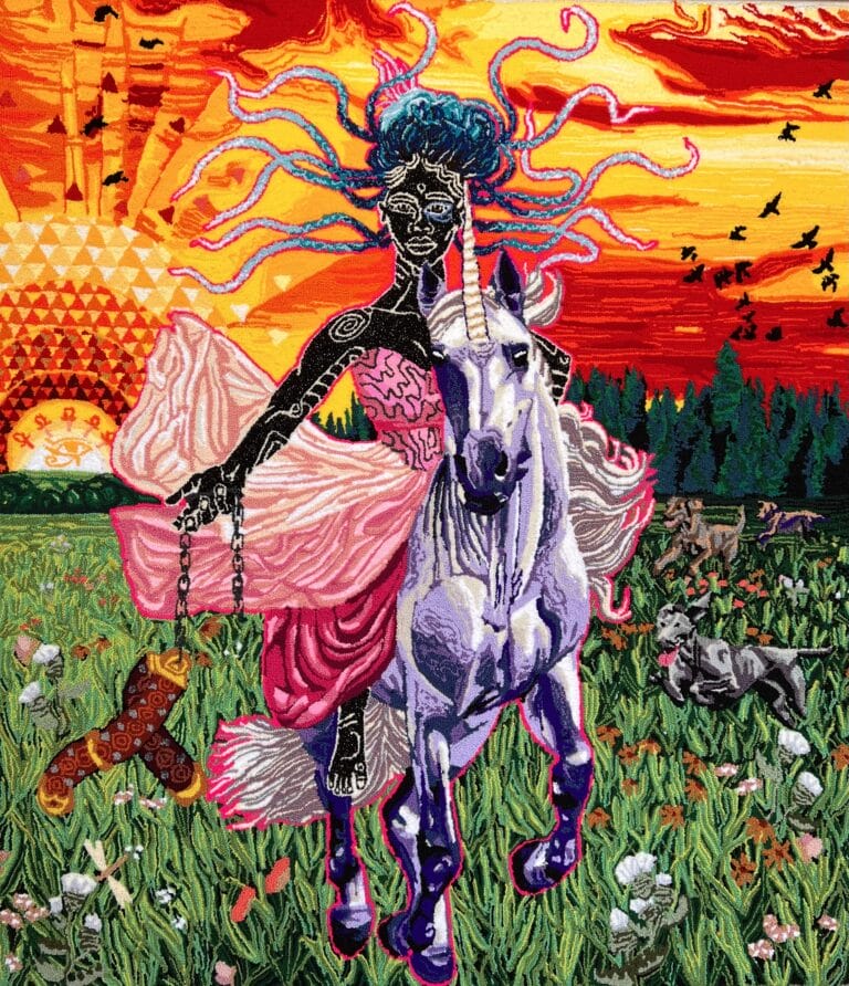 In her dazzling and richly symbolic textiles, Simone Elizabeth Saunders threads together history, myth, and identity with an unapologetically bold hand. Using vibrant tufted fabrics as her medium, Saunders crafts visual narratives that radiate strength and personal sovereignty. Words like “TRUTH” and “LOVE” are woven into her compositions — not as decoration, but as declarations — alongside patterns and figures that pulse with cultural memory. Her art functions both as a reclamation and an elevation of a craft once dismissed as decorative, challenging long-held assumptions about whose stories are preserved and celebrated in galleries and institutions.