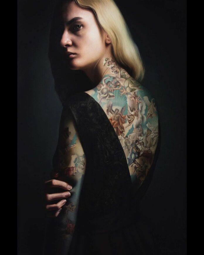 Nienartowicz’s work is characterized by its technical precision, bordering on hyperrealism. Each subject is portrayed with incredible accuracy and detail, making it difficult to distinguish between the painting and reality. Her paintings often incorporate motifs from well-known artists like Caravaggio, Hokusai, and Sandro Botticelli, which adds a layer of historical significance to her work. The artist’s use of classical art as tattoos on the skin of her subjects serves as a powerful tribute to the past while also looking towards the future.