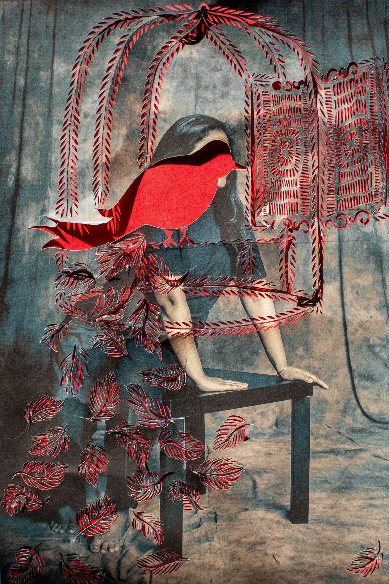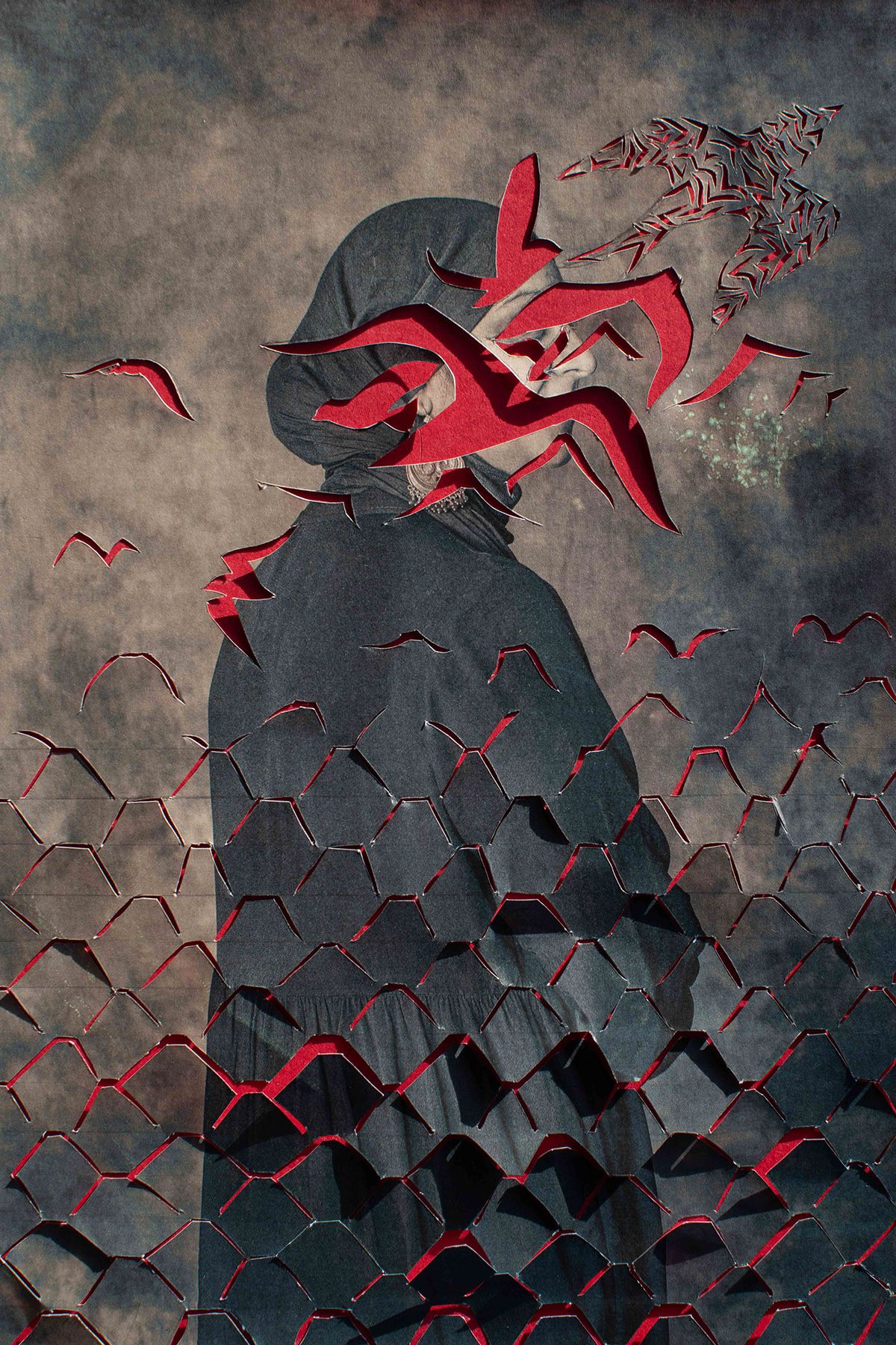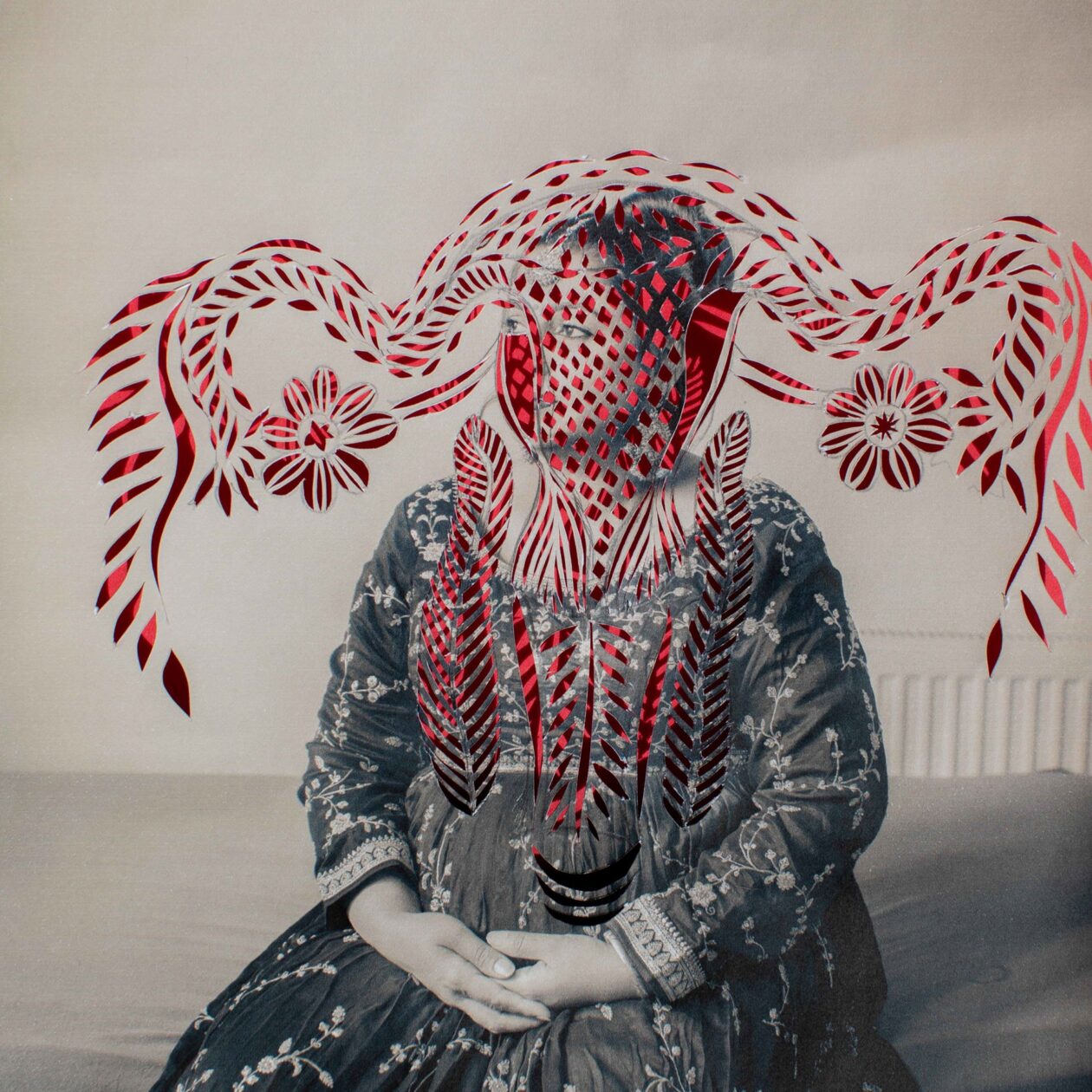 Setia’s artistic choices further underscore the themes of her project. The A4 size prints emphasize the commonplace and private nature of domestic violence. Her incorporation of sanjhi, the traditional Indian paper-cutting art, adds another layer of meaning. The intricate incisions on the portraits of anonymous participants reveal deep red backgrounds and recurring motifs of flora, birds, and female anatomy. The color red symbolizes not only sacrifice and resilience but also the promise of new beginnings for these women. The complex patterns reflect the intricate realities of South Asian women navigating societal expectations after experiencing domestic abuse.