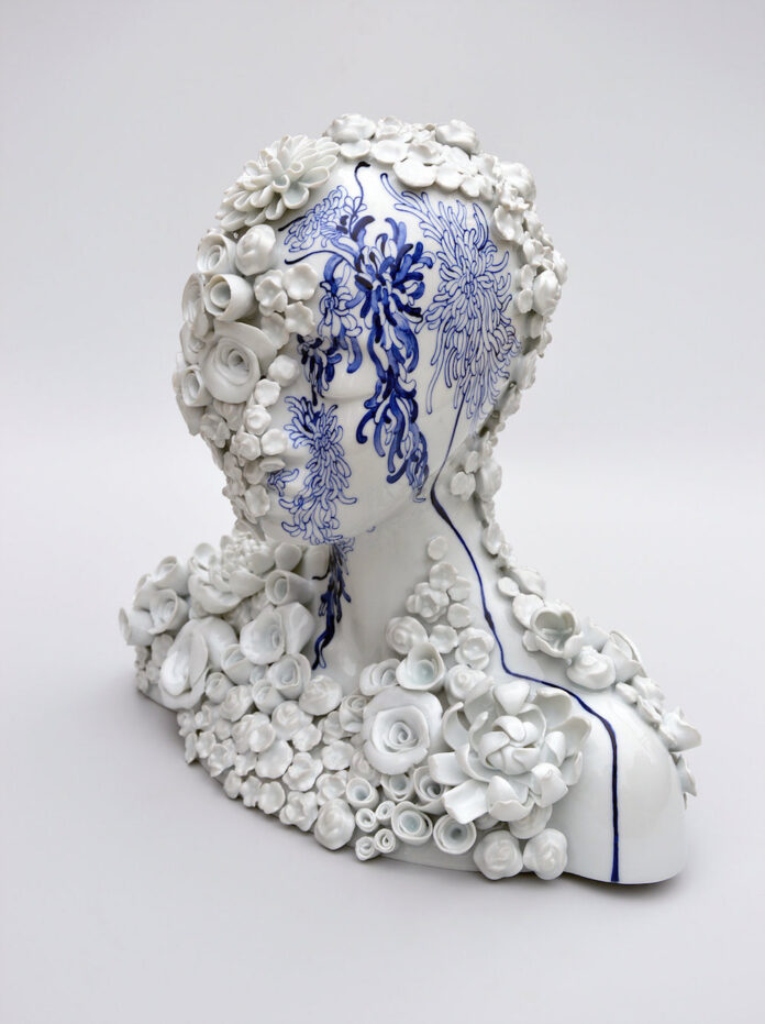 Juliette Clovis, a French artist, transforms the delicate medium of porcelain into a canvas for her surreal explorations of the female form. Her sculptures are a confluence of human, animal, and botanical elements, creating hybrid beings that evoke mythological narratives. Each piece is meticulously handcrafted, with wildlife, flora, and spikes adorning the simple busts, masking their features and inviting contemplation on the relationship between humanity and nature.