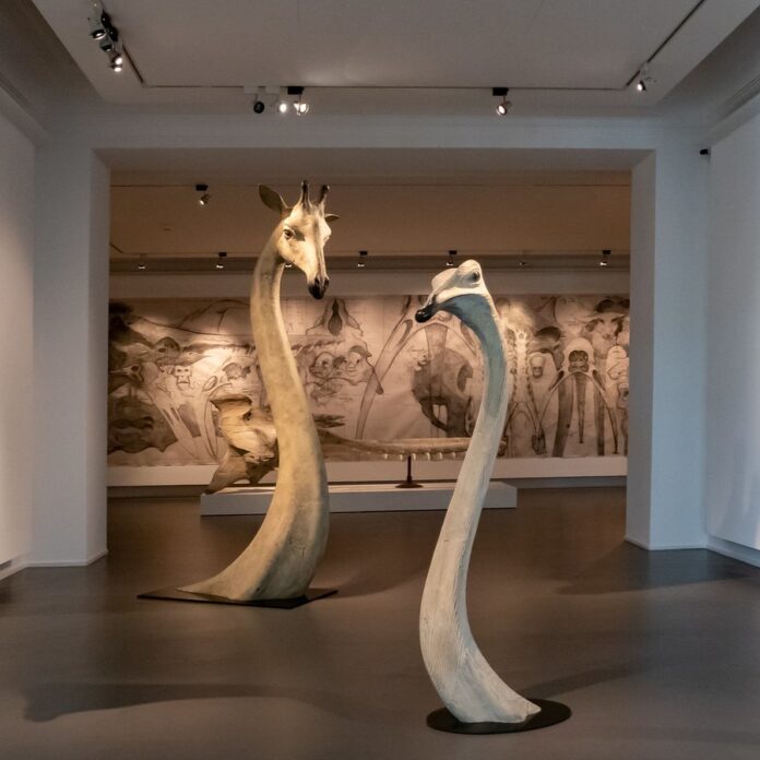 These works challenge the observer to consider the implications of viewing animals as mere objects for human consumption and entertainment. Garel’s pieces, which range from stylized skulls to life-sized figures, confront the audience with a direct gaze, prompting a moment of introspection about the relationship between humans and the animal kingdom.