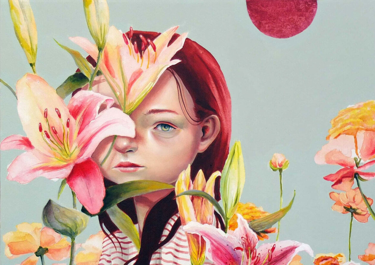 In Anne Angelshaug’s art, the boundaries between reality and imagination dissolve into intricate dreamscapes. Drawing deeply from her Norwegian roots and her upbringing in the lush landscapes of Jølster, she constructs surreal scenes that feel both deeply familiar and mysteriously foreign. Each composition becomes a quiet collision of nature and humanity, where flora and fauna coexist with solitary human figures, not in harmony, but in contemplation. The stillness of her subjects, often surrounded by birds, plants, or open skies, holds a quiet intensity — like nature frozen mid-thought.