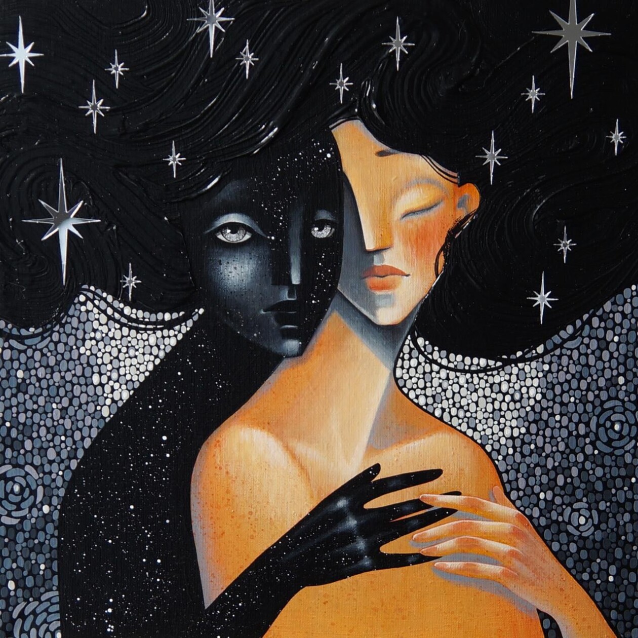 Olesya Dubovik, known as Azyza, explores the intricate boundaries between reality and the subconscious through her series of surreal and decorative paintings. Her exhibition, titled “Infinite Dots”, highlights a unique visual language where feminine silhouettes merge with sprawling natural landscapes and cosmic patterns. These works often portray central female figures surrounded by symbolic elements such as blooming flora and mystical animals, suggesting a profound spiritual connection to the environment.