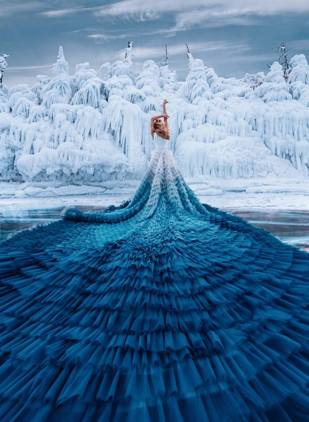 Kristina Makeeva (previously featured), a talented Russian photographer, has created a breathtaking fashion photography series titled “Baikal Fairytale,” set on the frozen waters of Lake Baikal in southern Siberia. Known as the world’s oldest and deepest freshwater lake, Baikal transforms into a mesmerizing winter wonderland when it freezes. Makeeva’s images capture the vibrant, icy landscape with an ethereal quality, where the clear, blue ice contrasts beautifully with the surrounding snow-covered terrain. Her work highlights the natural patterns formed by the ice, including intricate cracks and bubbles, giving the lake a fairy tale-like appearance.