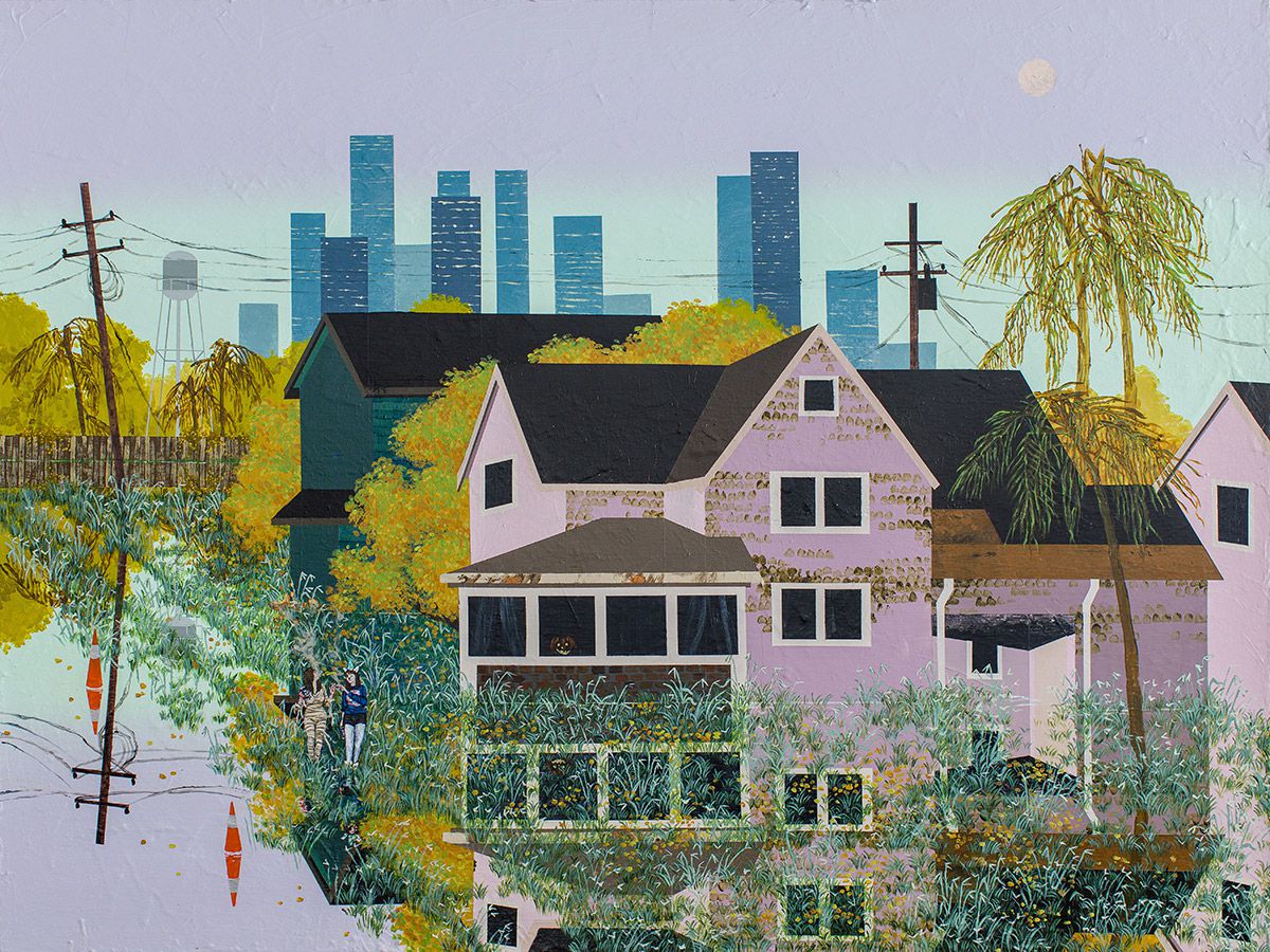 My recent paintings are narrative cityscapes, fixating on snapshots of blighted neighborhoods in a fictional coastal city based largely on New Orleans. These areas are within view of the bright and bustling downtown, yet they are literally sunken and forgotten, their streets quietly drowning beneath a stagnant and perpetual flood. Houses and backyards are swallowed whole by hungry sinkholes, while lone pedestrians get stoned under street lights darkened by an ever-expanding canopy of verdant leaves.
