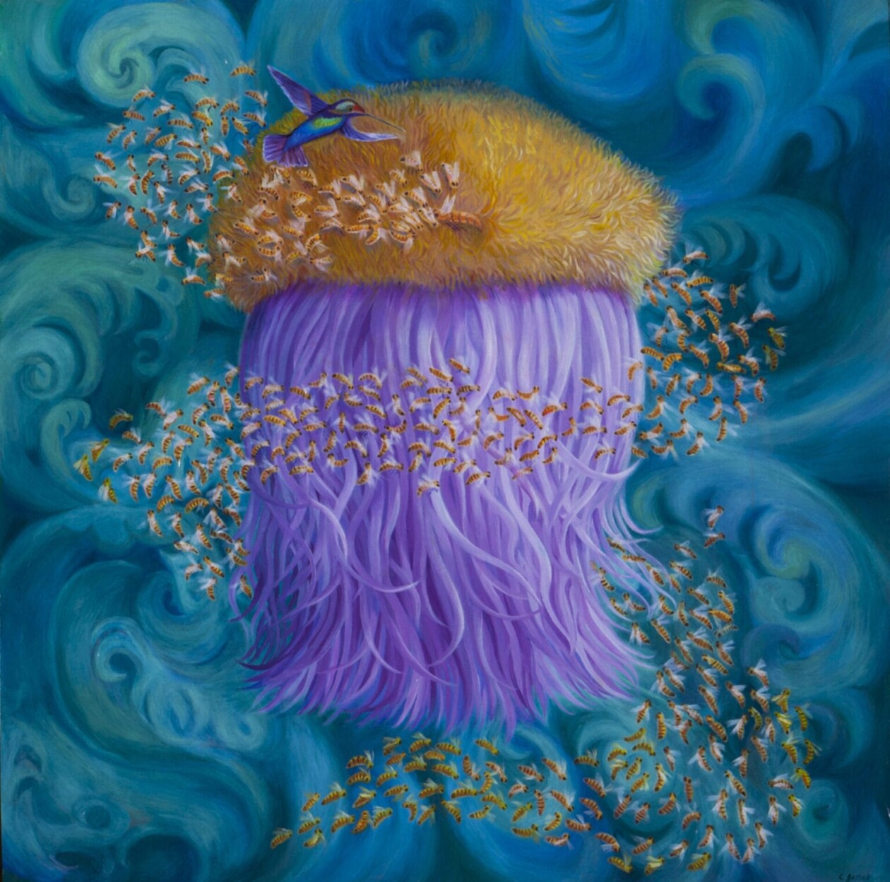 James uses the 18th-century style of “grotesquerie” to portray the forms and colors of her subjects, creating a contrast between the realistic and the surreal. Her paintings are also a commentary on the environmental issues that threaten the survival of bees and other pollinators, such as global warming, pesticides, and genetic modification. James hopes to take the viewer on a journey into a dreamlike setting, where the bees are the protagonists of a story of survival and adaptation.