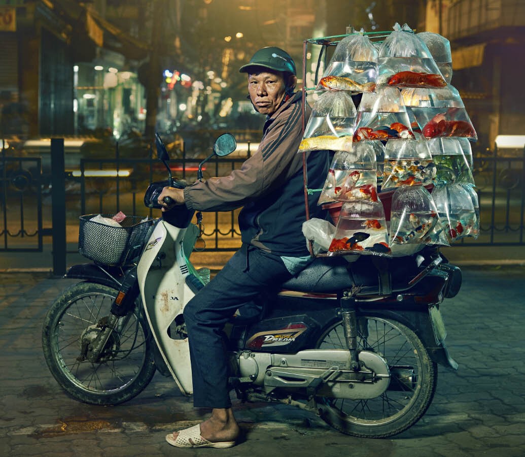 Bikes of Hanoi is a stunning photo series by Jon Enoch, a British portrait photographer who traveled to Vietnam to document the unique and colorful culture of motorbike delivery drivers in the capital city. The series captures the amazing balance skills and creativity of the drivers, who transport a wide range of goods on their bikes, from car parts and eggs to live fish and flowers. Enoch spent a week in Hanoi, chasing down riders and convincing them to pose for the camera, sometimes paying them a small fee for their time.