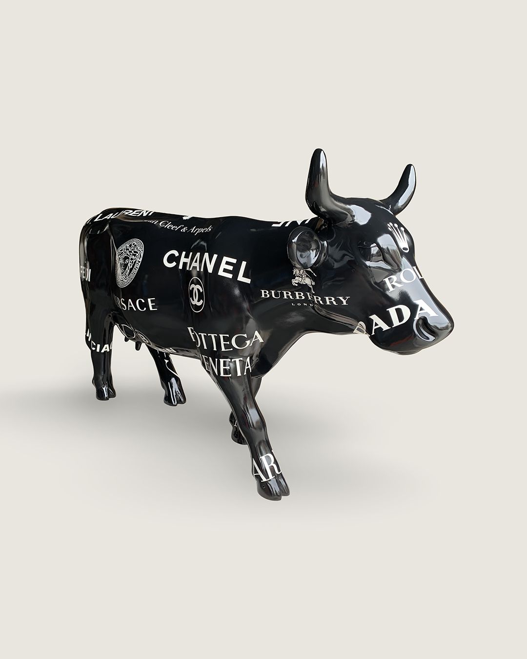 Paula Crown’s very fashionable cow sculpture Branded is currently on view in the “pasture” at Industry City, New York, Crown’s sleek-looking black cow branded with the luxury labels of today prompts us to consider the idea of the “brand” both in mark making; the literal searing of symbols of forced ownership, and the displaying of association to luxury or identity; the modern iconography, showing your approval of a labels philosophy. On September 30th, this, and other works in the CowParade project will be auctioned off with all proceeds benefiting God’s Love We Deliver, an organization committed to improving the health and well-being of men, women, other persons, and children living with HIV/AIDS, cancer, and other serious illnesses.