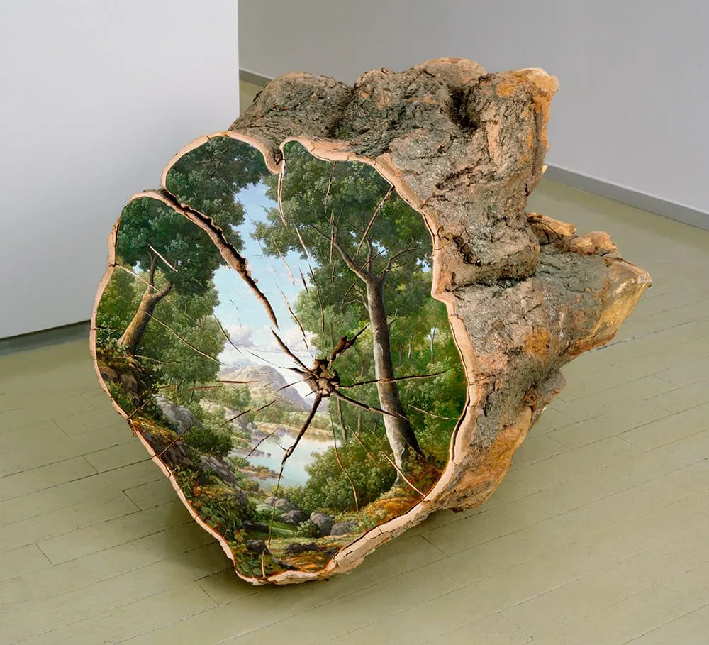 Through the innovative artistry of Alison Moritsugu, traditional bucolic landscapes are reimagined as immersive, poignant pieces that challenge the audience’s perception of nature and art. Drawing inspiration from revered 18th and 19th-century painters like Albert Bierstadt and Frederic Edwin Church, Moritsugu creates paintings directly on the cut surfaces of tree trunks. These works transport the us into a bygone era of artistic expression, where untouched landscapes were celebrated as an infinite bounty. Yet, this portrayal of harmony is paradoxically disrupted by the direct juxtaposition of the painting’s surface — the raw and often jagged cross-section of a tree — serving as a stark reminder of ecological loss and human intervention.