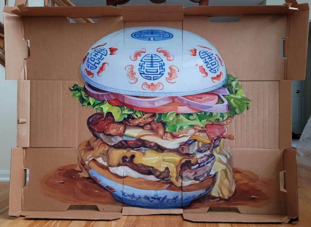Chunbo Zhang, a Chinese artist based in Chicago, explores cultural contrasts in her “Food Treasure” series by blending elements of American cuisine with traditional Chinese porcelain motifs. In these acrylic and watercolor paintings, she portrays foods like cheeseburgers and deep-dish pizzas with buns and crusts adorned in intricate ceramic patterns. This fusion highlights the juxtaposition between the indulgence of American dietary habits and the refined aesthetics of ancient Chinese artifacts.