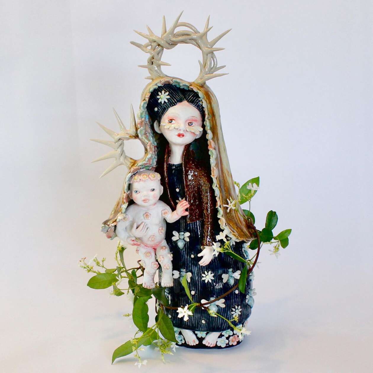 Clairy’s creations are renowned for their ethereal quality, often depicting wide-eyed ladies adorned with petal crowns and expressive features that convey inquisitiveness, sass, or subtle mischief. Her work delves into themes of life, death, rebirth, and change, employing symbolic motifs and improvised forms reminiscent of natural shapes. The use of muted saccharine colors, high gloss dark tones, and rich lusters amplifies the contrasts between good and evil, life and death, in her pieces. Each sculpture is unique, combining hand-building and wheel-throwing techniques to bring her imaginative characters to life.