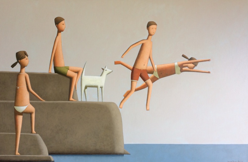 Through his paintings Craig creates a unique visual iconography of coastal living. His imagery pays homage to the architectural forms and easy-going lifestyle of the urban coastal landscape. Craig’s perspective is positive, youthful and essentially humanist in its celebration of life’s simple pleasures. His strong sense of colour and form capture everything we love about the beauty of the coastline and the pleasure of being near the water. The tonal variations of umber beach figures in contrast to the turquoise sea and raspberry reds and oranges of bathers’ beach apparel create warmth that glows on the canvas.
