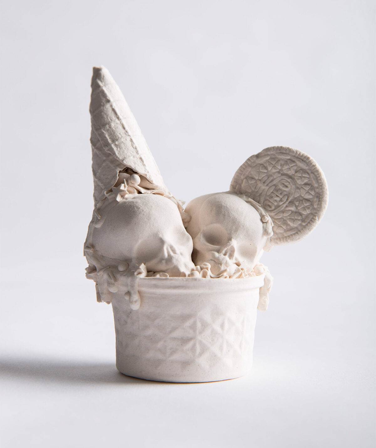 My work speaks to the anxieties of being human, particularly the dilemmas of everyday urban life. It is an ongoing exploration of shameless consumerism, both tangible and digital, to celebrate the beauty and flaws of this fragile condition. In this current body of work I call ‘Death by Sugar,’ I use a variety of sculpting techniques such as hand building, carving, plaster mold making, slip casting, and slip piping. Intricate porcelain confections are created with an irresistibly perturbing charm, resulting in a surreal dimension beyond dreams where sugar and fetus skulls are remixed into a delicate bittersweet pop narrative.