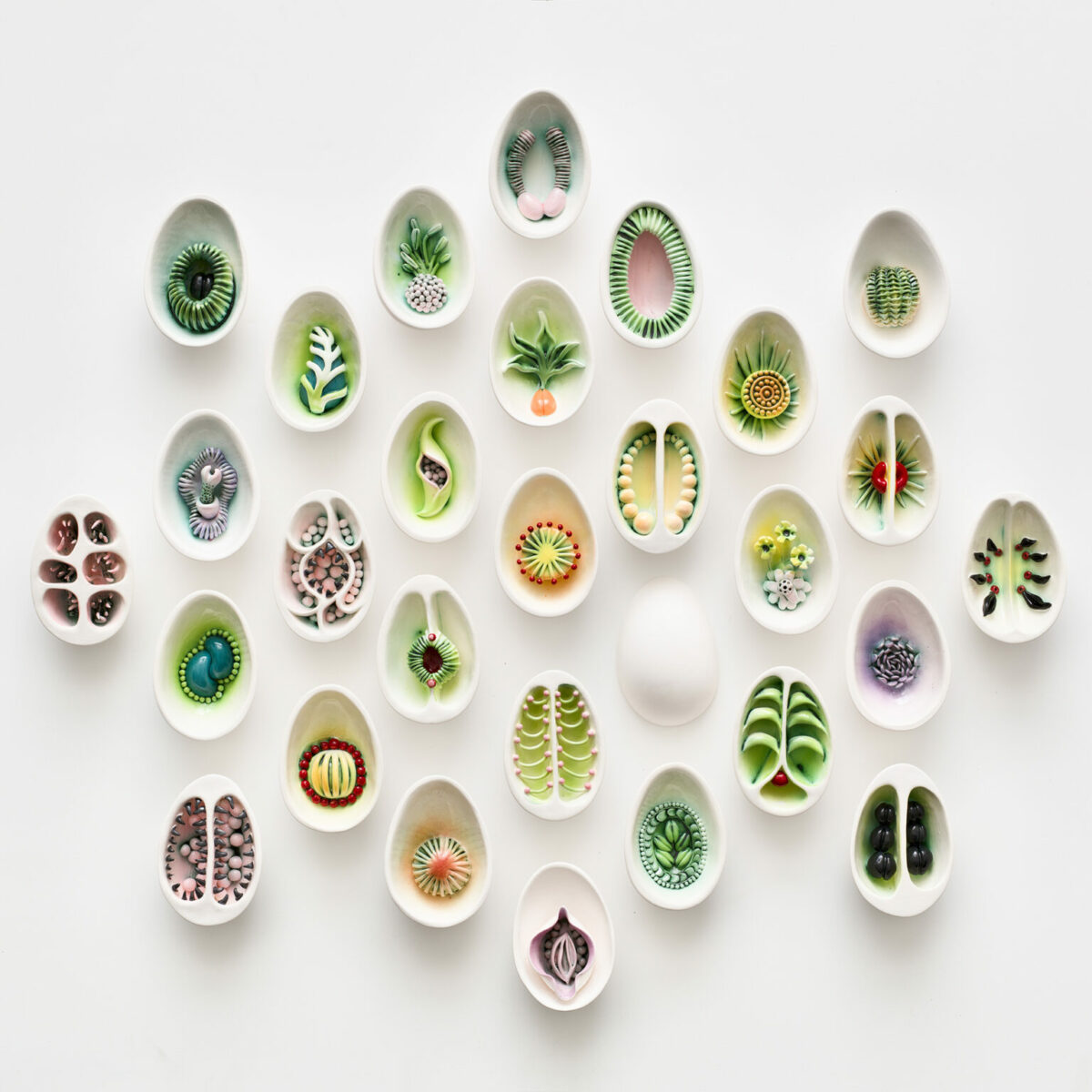 Melbourne-based artist Sally Kent isn’t your typical sculptor. Instead of working with cold, hard stone or rough-hewn wood, Kent’s medium of choice is delicate porcelain. But her sculptures aren’t bowls or vases – they’re stunning recreations of nature’s hidden wonders. Kent meticulously crafts cross-sectioned pods, their intricate chambers revealed, and cradles them within a casing of seeds, vegetables, and other organic elements.