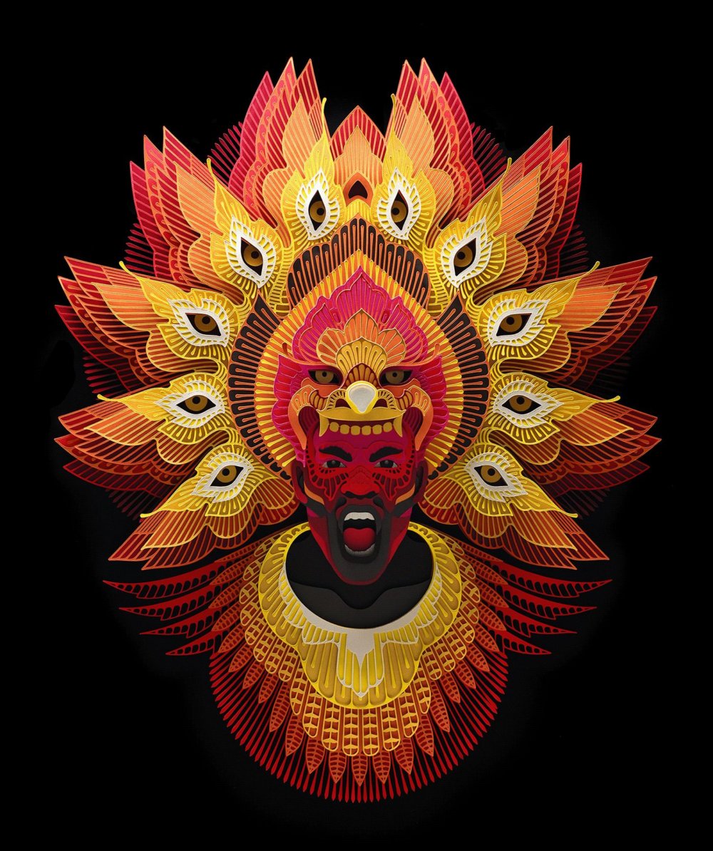 Patrick Cabral, a talented Filipino artist, has created a stunning paper art series titled “Dinagyang Mask”, which pays tribute to the dualities of life. Inspired by the vibrant Dinagyang Festival, Cabral’s intricate masks explore themes such as Heaven and Earth, Good and Evil, and Calm and Chaos. Each mask is meticulously crafted, featuring elements that symbolize different aspects of nature and human experience. For instance, the “Langit” mask, with its bird-like features and dominant blue hues, represents air, flight, and dreams, while the “Lupa” mask, with dragon-like features and fiery colors, embodies earth, fire, and passion.