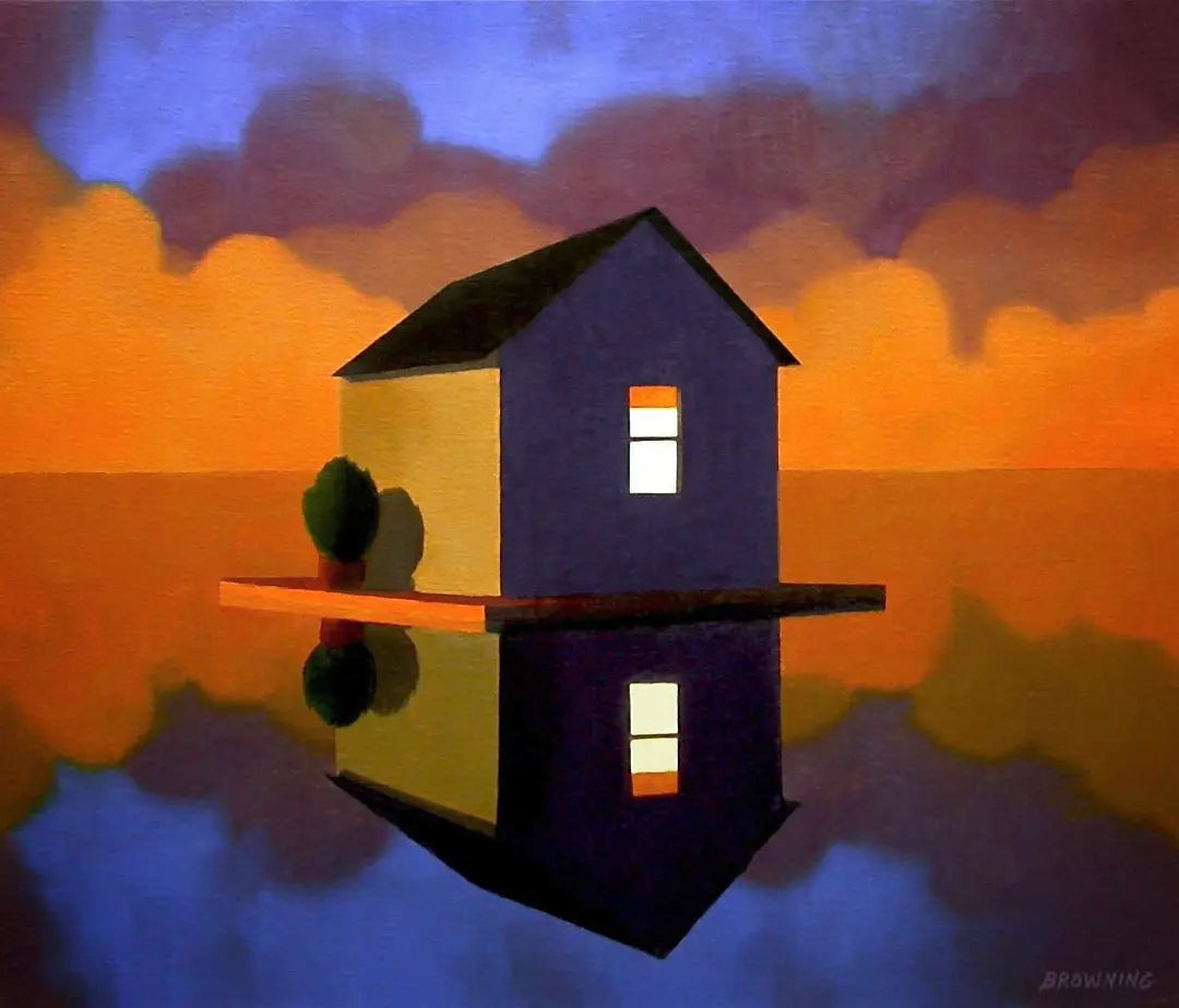 Browning’s art, often featuring rows of fluffy white clouds set against cerulean skies, evokes an idealized version of reality, one that is both enchanting and slightly unsettling. His unique vision captures the essence of surrealism, drawing the observer into a world where the mundane intersects with the fantastical.