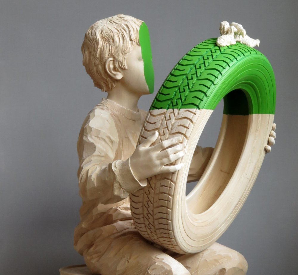 I think colour is the most important part of my work. In art school I studied painting and not sculpting. The colour I use overwhelms my figures. It does not underline a narration, but the narration itself revolves, questions and changes with this additional visual. A tension, a conflict, as well as unity and harmony occur between colour and wood. Colour often has a symbolic value. I often use a range of colours according to the symbolism, or in connection with a specific expression, but it is not a rule; sometimes I also use a completely opposite colour (something that is counter intuitive) to surprise the viewer. (…) I don’t like when people see me as a surrealist. The surreal movement had the concept very different from what I try to achieve. However, humour and absurdity is very important for me. Both help to see the reality better. My greatest effort and my greatest research focus on not remaining fossilised on the naturalistic representation of the figure, but on giving something more. Through a dreamlike study, or better still absurd, rather than fantastic, because I often see real situations it is those that stimulate and greatly influence my work.