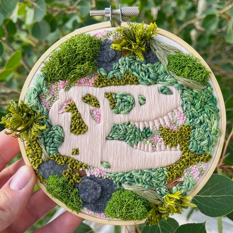 Crisp’s love for nature extends beyond prehistoric times, drawing inspiration from animals, woodlands, plants, and mountains. Her unique pieces are a blend of paleontology and artistry, inviting viewers to explore the beauty of the natural world through the lens of embroidery.