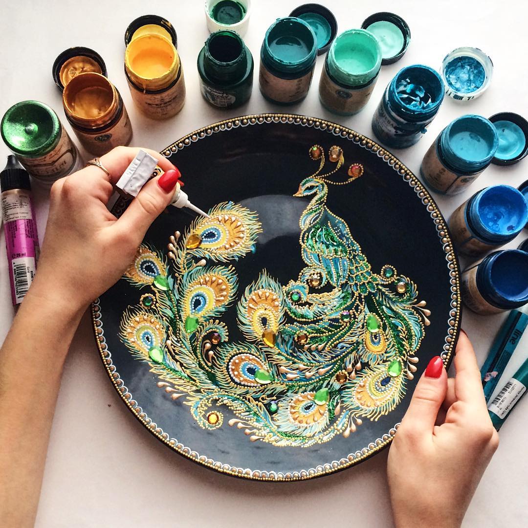 Russian artist Daria, known as Dahhhanart, creates enchanting plates adorned with intricate pointillism. Using acrylic paint, enamel, rhinestones, and colored decorative stones, Dahhhanart brings a touch of elegance to these everyday objects. The artist’s unique technique of pointillism, where small dots are used to form larger images, adds a mesmerizing quality to the plates, making them stand out as works of art.