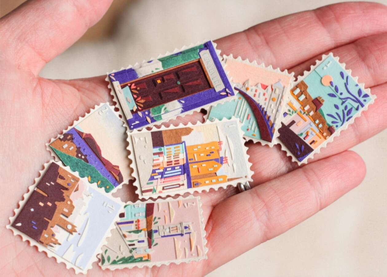 Glasgow-based artist Laura K. Sayers transforms paper scraps into intricate stamp-sized collages, each encapsulating a miniature world. Her process begins with selecting a harmonious color palette, often painting over sheets to achieve the desired tones. Drawing inspiration from her own photographs, Sayers creates quick thumbnails to guide her designs. Using sharp scissors and a scalpel, she meticulously assembles layers of paper into familiar landscapes, complete with perforated edges and occasionally nestled within painted frames.