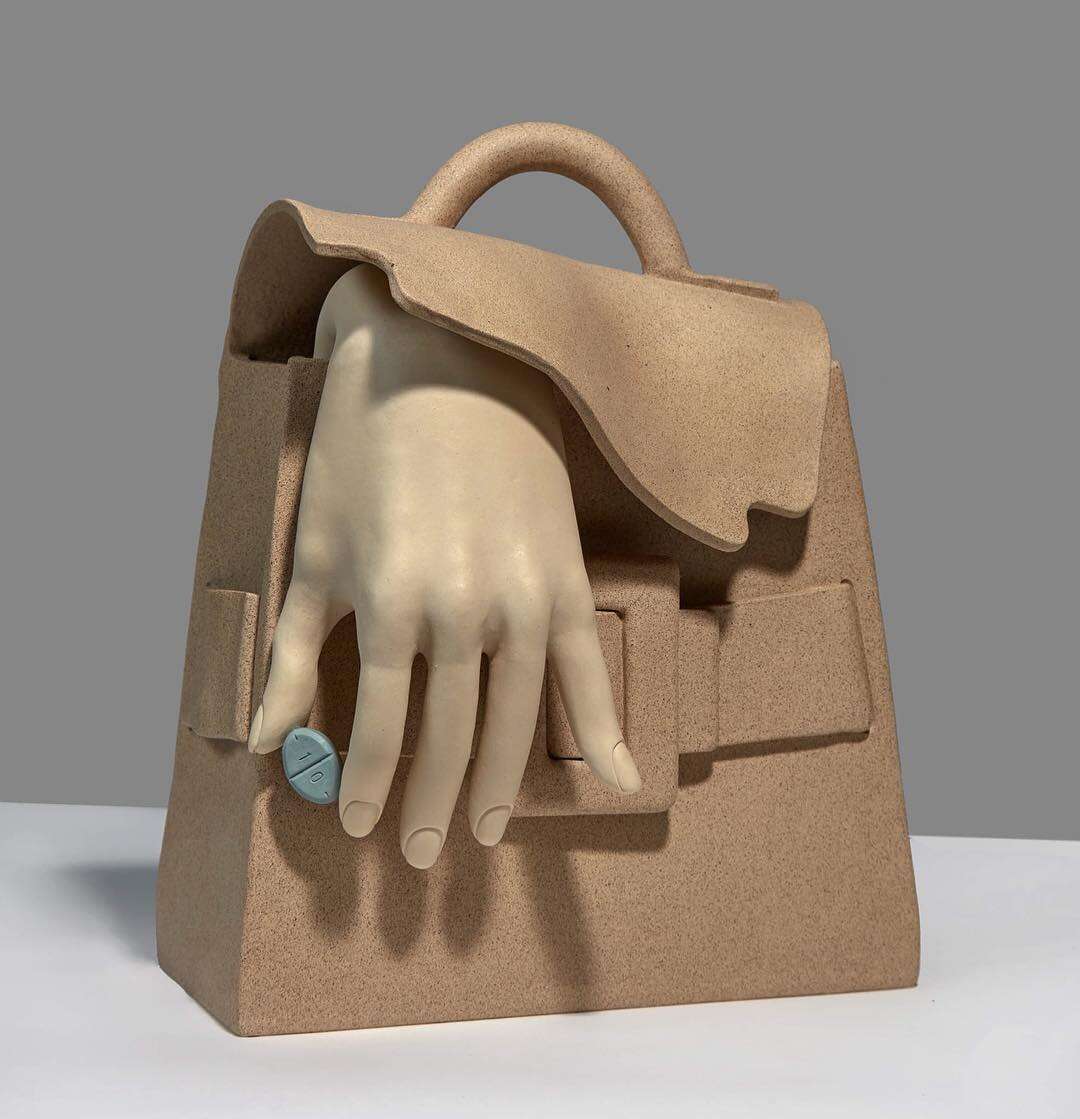 Genesis Belanger’s art transforms everyday objects into surreal vignettes that challenge our perceptions of consumerism and gluttony. Her sculptures, often crafted from porcelain, stoneware, metal, wood, and upholstery, are imbued with pastel colors that evoke a sense of nostalgia and whimsy. These illustration-like pieces depict familiar household items and parts of the human body in uncanny scenarios, such as disembodied hands holding oversized pills or plush lips emerging from bouquets of flowers.