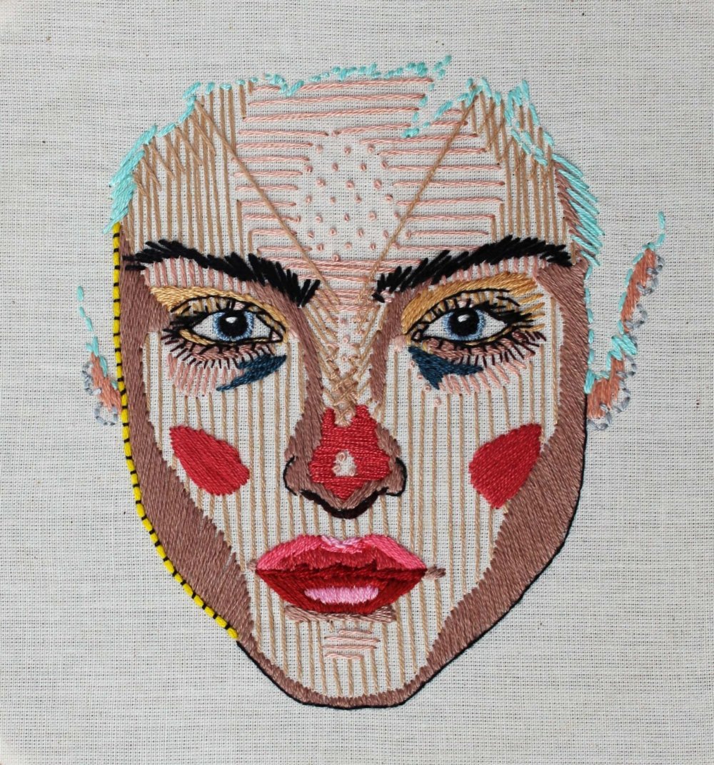 These hoop-bound portraits are not only expressive but also dotted with playful elements, such as jaws outlined in pink or highlights stitched in bright, geometric shapes. With a background in Fine Arts and Textile Art, Risquez has developed a unique style that has been featured in various art publications and is available for commissions.
