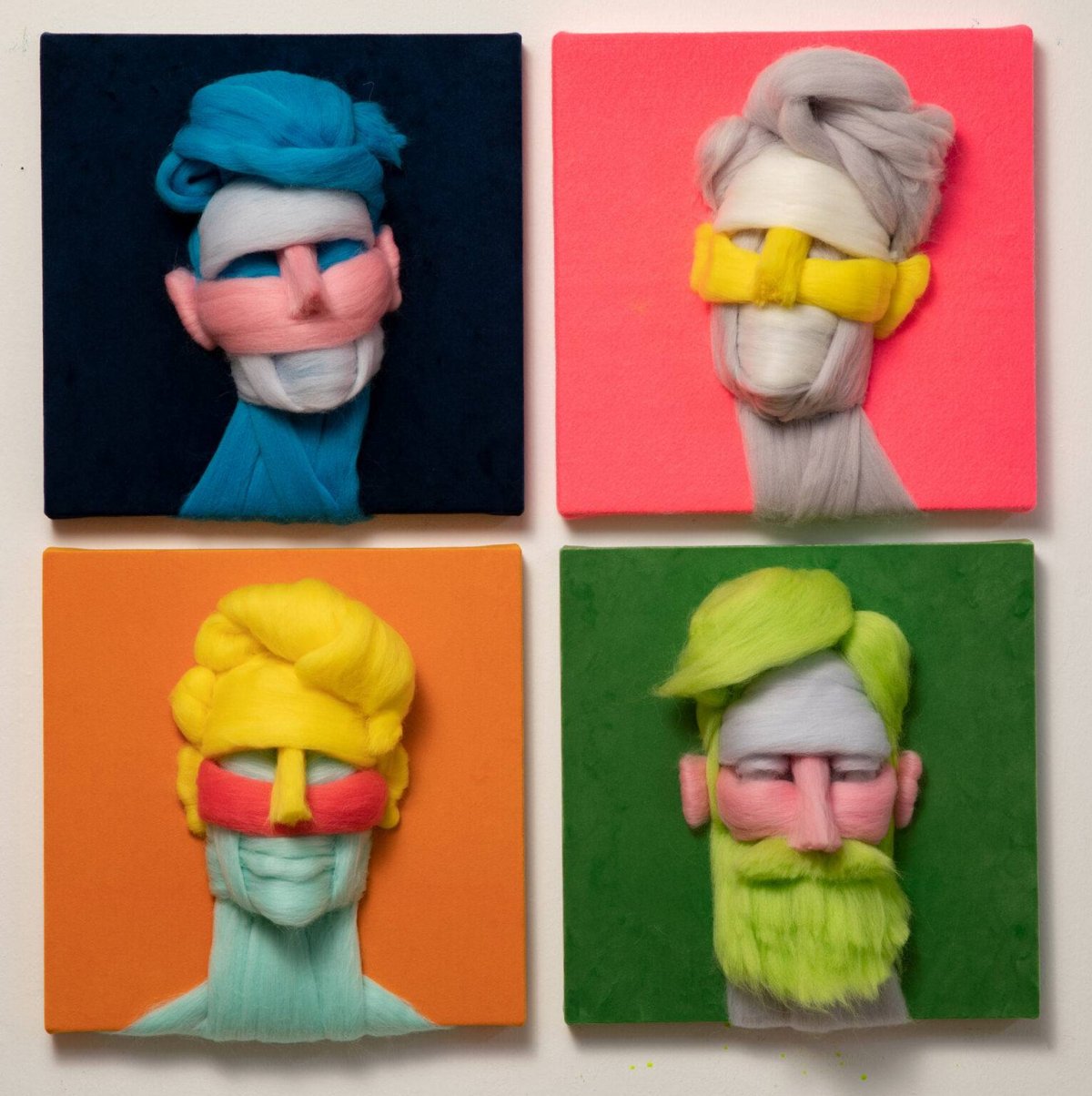 The Wool on Foam portraits are tied to my experience of quarantine and recent trauma. Weaving inanimate fibers into faces brings me comfort and helps deal with the issues. These portraits are delicate and vulnerable and resonate with my own precarious situation. We live in fragile times, and I feel the need to find new materials and the mindset to reinvent my practice. Wool brings warmth and intimacy to these portraits, and plays with provoking the nurture instinct. Making male portraits with this habitually perceived feminine material, is part of a personal journey in re-interpreting the masculine condition. My aim is to make full volume sculptures in wool and develop some of the ideas out of this initial project.