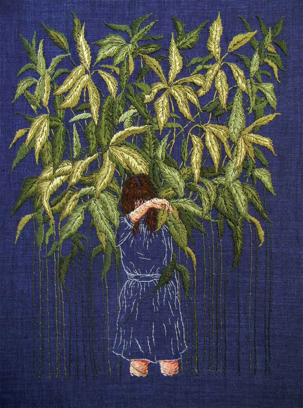 My work explores psychological landscapes, illuminating thoughts left unspoken. I create tiny worlds in thread to capture elusive yet persistent inner voices. Literary snippets, memories, personal mythologies, and art historical references inform the imagery; fused together, these influences explore relationships, domesticity and self-perception. Symbolism and allegory lay bare dynamics of aspiration and limitation, expectation and loss, belonging and alienation, truth and illusion. Decidedly miniature in scale, the scenes are densely embroidered into compressed compositions. While the work acknowledges the luster and lineage inherent in needlework, I use thread as a sketching tool in order to simultaneously honor and undermine this tradition. Beauty parallels melancholy, as conventional stitches acquiesce to the fragile and expressive.
