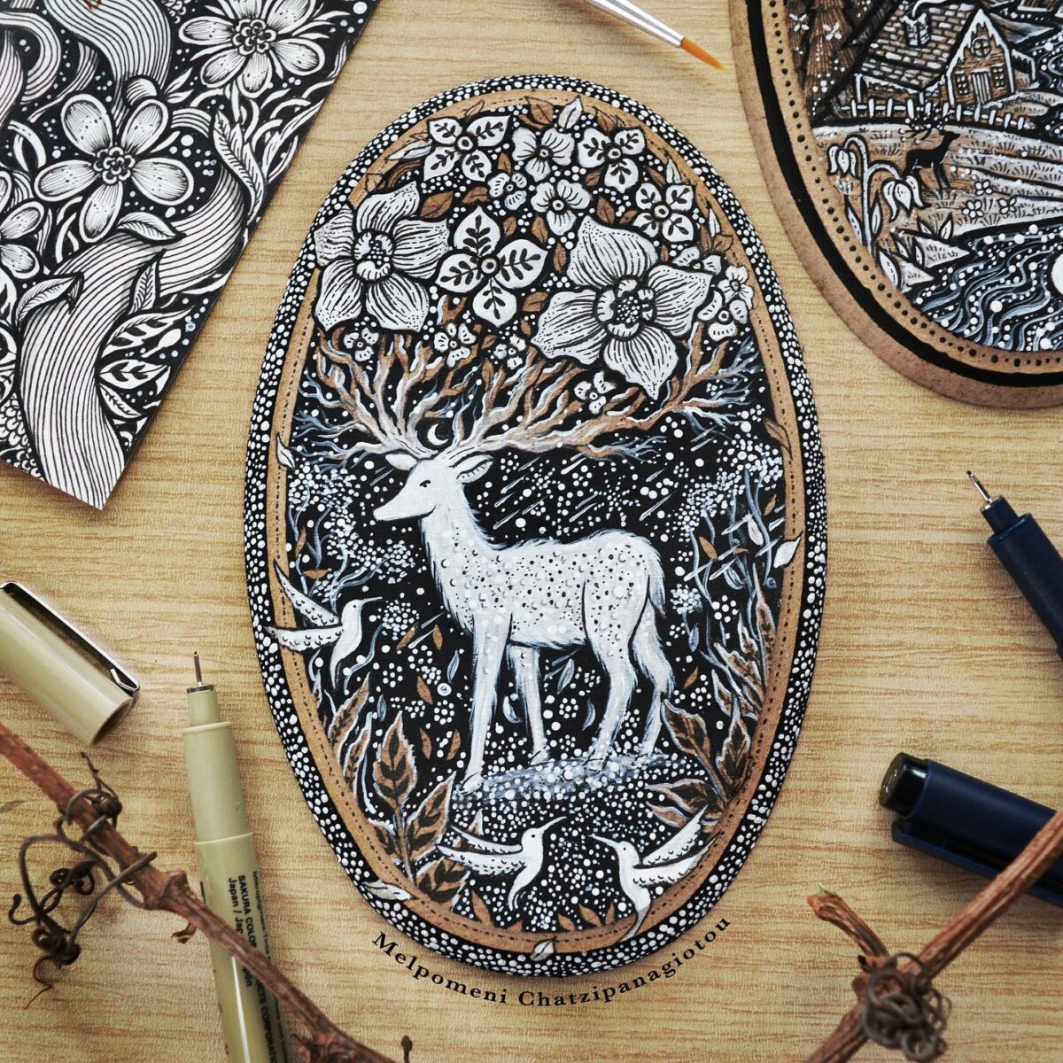 Melpomeni Chatzipanagiotou crafts a mesmerizing universe from the rustic simplicity of wood slices, marrying artistic precision with the raw beauty of nature. Her work, etched in a monochromatic palette, transcends traditional illustration by using wooden canvases that infuse each piece with organic vitality. The texture and grains of the wood enhance the depth and complexity of her detailed pen, ink, gouache, and acrylic creations, lending an intricate tapestry that is both tactile and visually arresting. The natural contours of the slices offer unexpected challenges and opportunities, allowing Chatzipanagiotou to transform each illustration into a unique narrative that resonates with observers, drawing them into an intimate dialogue with the natural world.