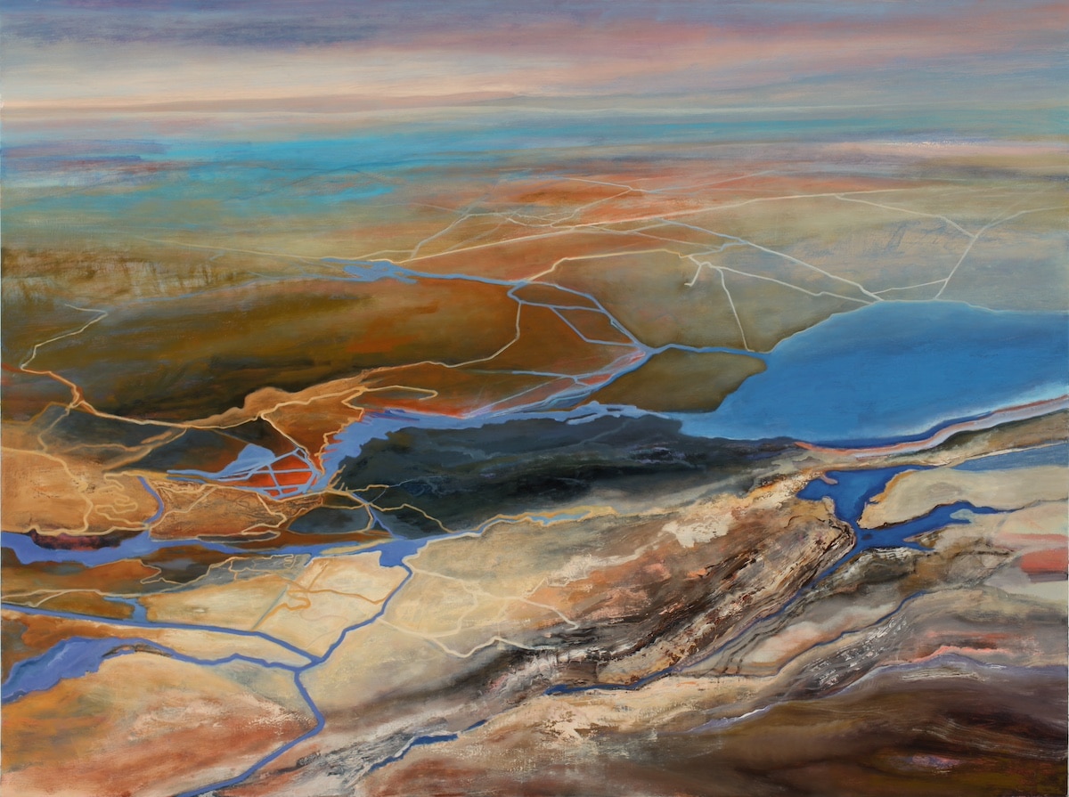 Philip Govedare’s oil paintings are a captivating blend of imagination and reality, presenting aerial views of landscapes that are at once familiar and otherworldly. His works are not mere representations of specific places but are instead inspired by a combination of memory, observation, and creativity, resulting in evocative scenes that challenge viewers to contemplate the intricate relationship between natural and man-made environments.