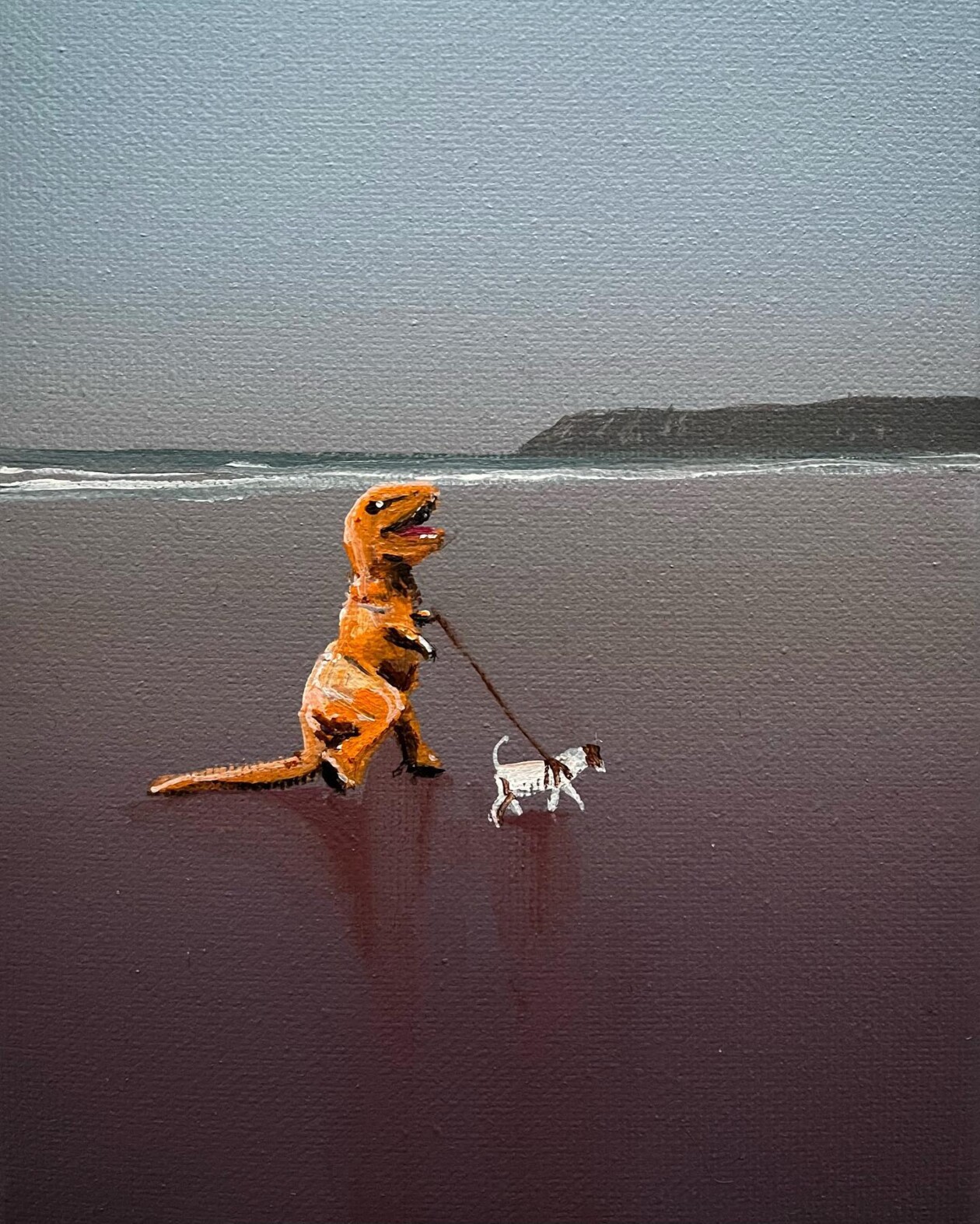 Mars Black, a United Kingdom-based artist, creates amusing small acrylic paintings that depict everyday situations with a surreal twist. His figurative works are characterized by a playful and absurdist atmosphere, inviting viewers to explore the unexpected and humorous elements within the scenes.