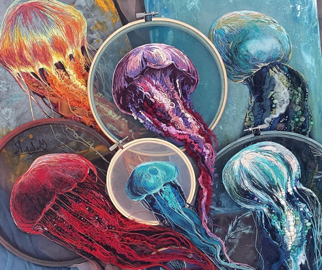 Yuliya Kucherenko is an artist who has brought a new dimension to the traditional craft of embroidery. Her unique jellyfish designs are not confined by the boundaries of the hoop, with tendrils that seem to float freely, extending beyond the frame. This effect is achieved through a combination of intricate techniques such as thread painting, needle felting, and beading, which together create a lifelike representation of these ethereal sea creatures.