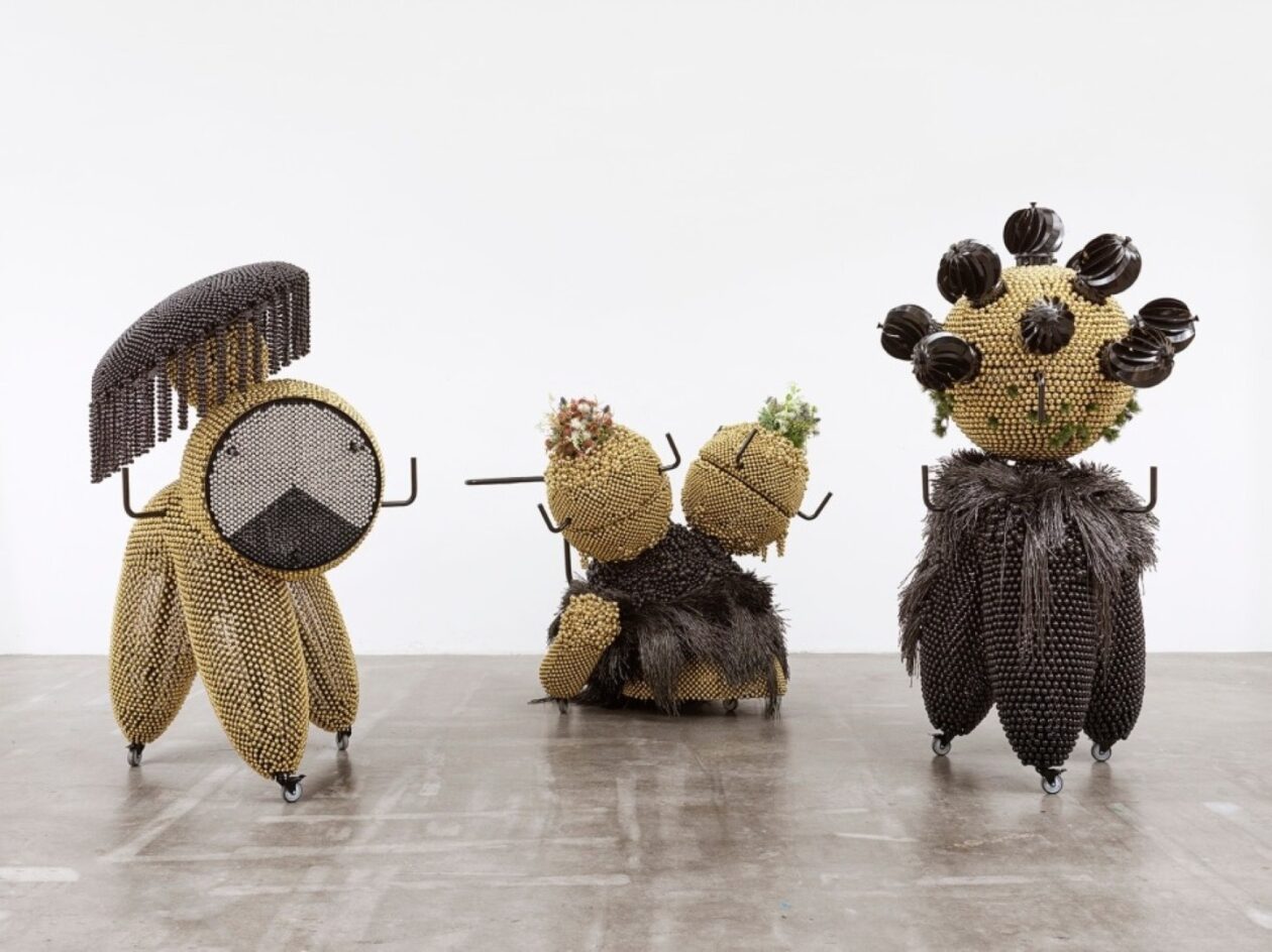 “Sonic Intermediates – Triad Walker Trinity” (2020), powder-coated steel and handles, casters, nickel and brass-plated bells, metal rings, plastic twine, turbine vents, artificial plants, pine cones, and foam. Photo by Nick Ash. Image courtesy of kurimanzutto, Mexico City / New York.“Frosted Scales Mermaid Queen – Mesmerizing Mesh #218” (2023), Hanji, washi, and origami paper on alu-dibond, framed, 24 3/8 x 24 3/8 inches. Image courtesy of kurimanzutto, Mexico City / New York.“Airborne Paper Creatures – Flutterers” (2025), birch plywood, wood stain, stainless steel components, Hanji, washi, origami paper, marbled paper, honeycomb paper balls, beads, metal bells, plastic crown flowers, parandy, Punjabi earrings and ornaments, stainless steel chains, split rings, steel wire ropes, and swivels, 47 3/4 x 22 x 25 1/2 inches, 21 3/4 x 12 1/2 x 9 1/2 inches, and 36 1/2 x 23 1/2 x 23 1/2 inches (three parts). Photo by Studio Haegue Yang.