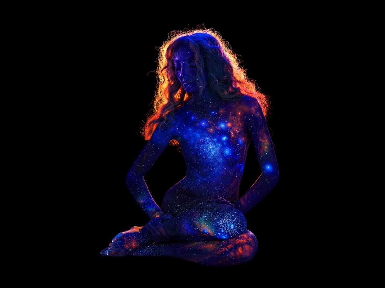 John Poppleton, an American artist, and photographer, has revolutionized body painting with his breathtaking “Bodyscapes”, a fusion of fluorescent pigments, black light, and human form. His artworks transform the skin into a living canvas, glowing with ethereal depictions of landscapes, galaxies, and natural wonders. Each piece is meticulously crafted, ensuring that the contours of the body enhance the depth and realism of the imagery. Whether it’s a fiery sunset, a stormy sky, or the Milky Way stretching across a model’s back, Poppleton’s work radiates an otherworldly beauty that transports the imagination to far-off places.