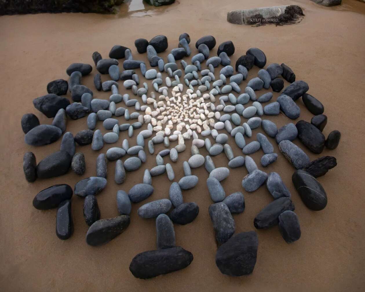 Jon Foreman (previously featured) continues to mesmerize with his captivating series of mandalas, mosaics, and patterns crafted directly from the elements of nature. Using leaves, stones, driftwood, shells, and other organic materials, Foreman creates large-scale compositions that blend seamlessly into the surrounding landscapes. His installations radiate harmony and precision, while simultaneously honoring the inherent irregularities and textures of natural objects. Through thoughtful arrangements and swirling patterns, Foreman’s creations evoke a meditative experience, inviting contemplation of the delicate balance between chaos and order in the natural world.