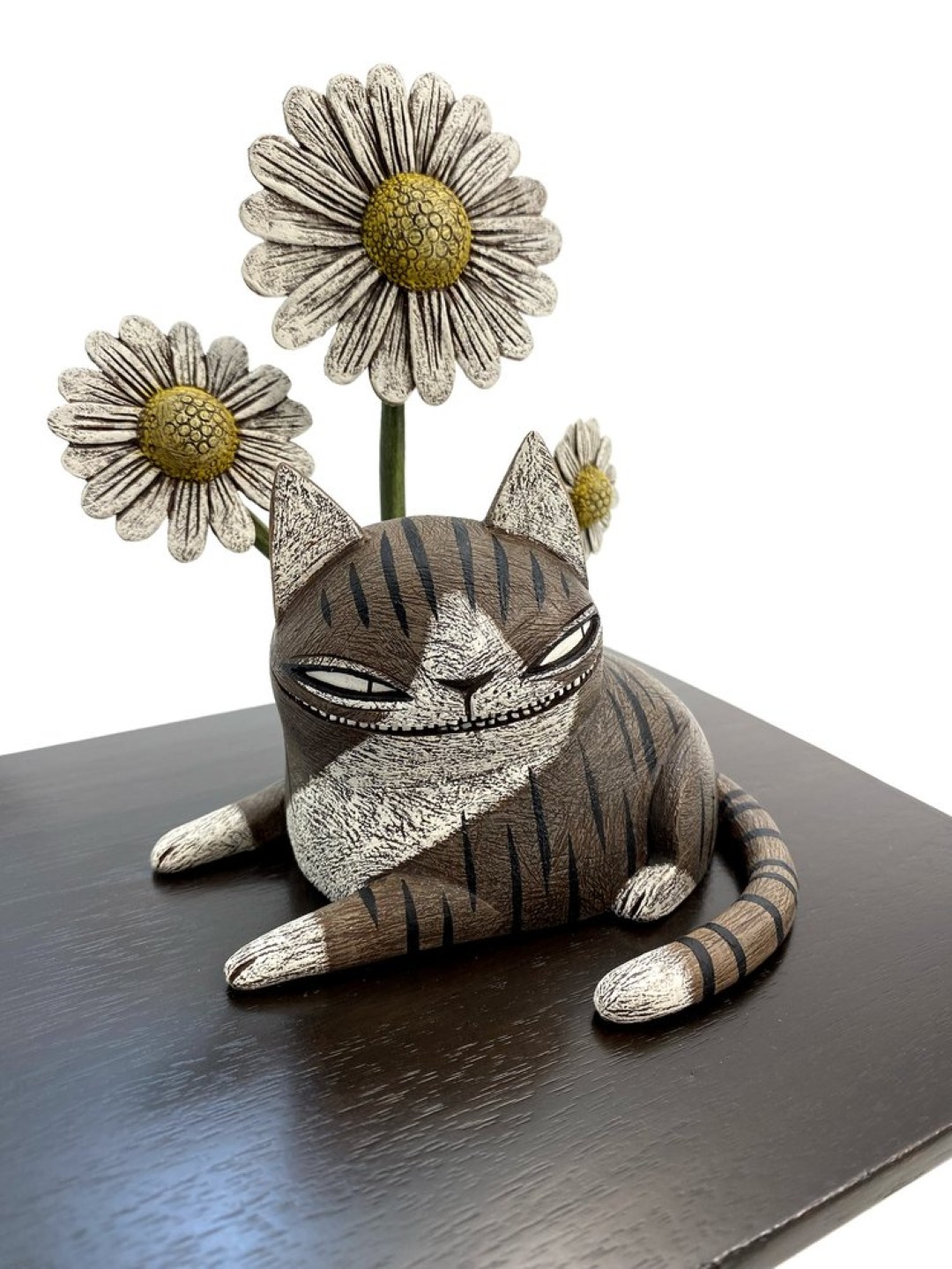 Kim Slate’s ceramic sculptures masterfully blur the line between endearing and unsettling, creating a distinctive visual language that captivates and unnerves in equal measure. Her hand-built creatures exhibit a paradoxical charm — their wide, glassy eyes and exaggerated features suggest animated cheerfulness, while subtle imperfections in their forms introduce an air of quiet peculiarity. This delicate balance between the familiar and the strange speaks to the artist’s ability to imbue static objects with a sense of lurking personality, as if each piece might blink or shift position when no one is looking.