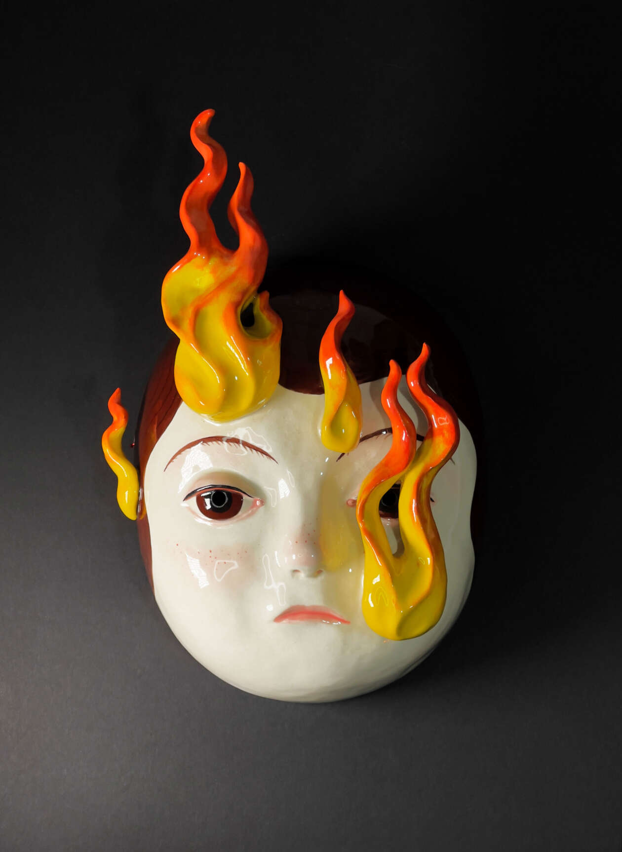 Lena Guberman’s latest series of ceramic sculptures, “INS_IDE_OUT”, delves into the complexities of childhood social anxiety. The works feature a recurring young girl’s face, evoking a sense of melancholy. Each mask is intricately designed with symbolic elements like spikes, arrows, and even dead birds, visually representing the emotional chaos of anxiety. Guberman’s art reflects the contrast between the polished exterior we present to the world and the internal turmoil that often bursts through, highlighting the struggle for personal expression in the face of fear.
