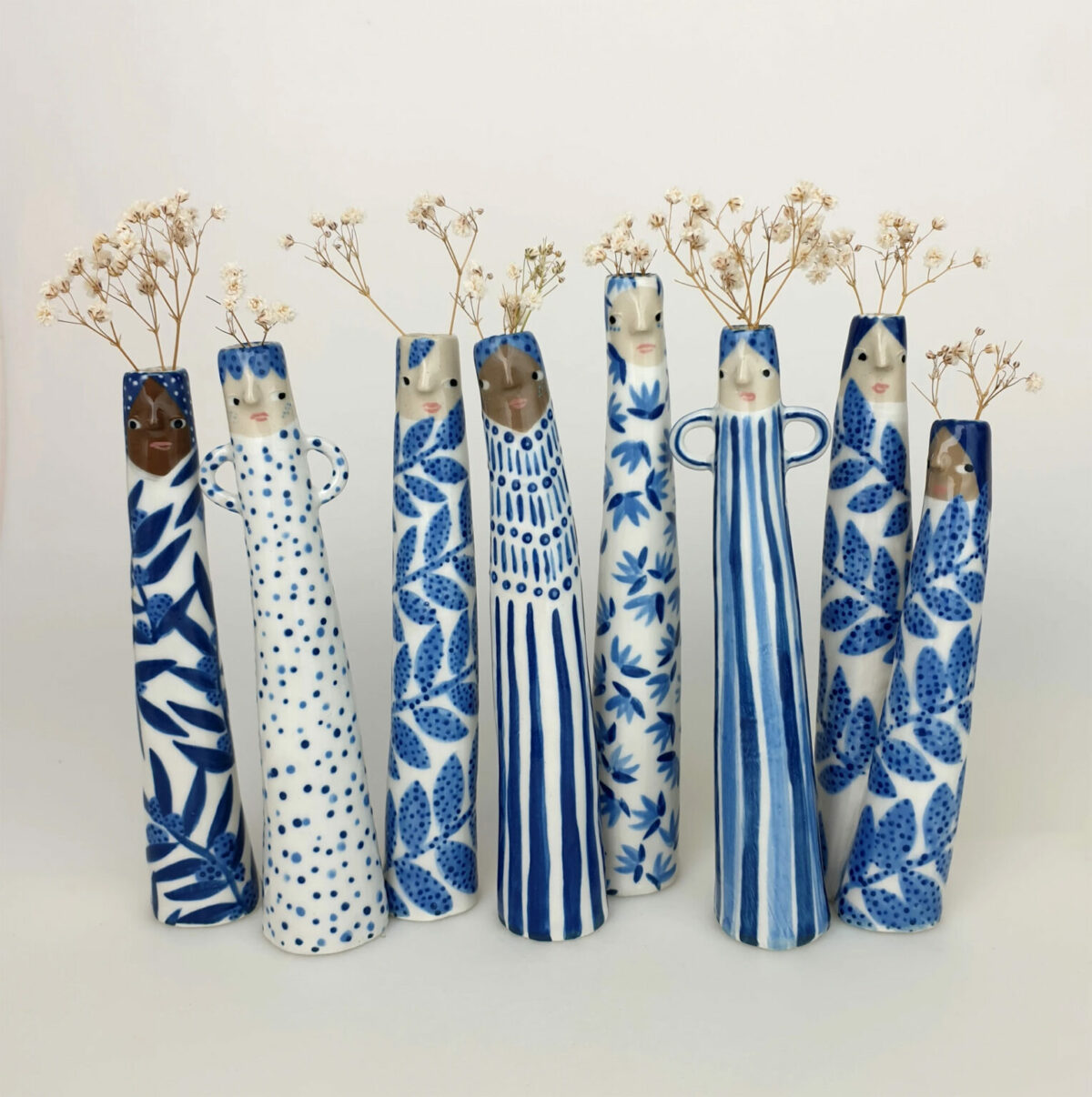Sandra Apperloo’s artisanal flair brings a whimsical touch to the world of ceramics, infusing everyday objects with a burst of creativity and personality. Anchored in the vibrant city of Utrecht, her work features a harmonious blend of functionality and imaginative design. Using an array of pastel hues, her pieces—a collection of planters, mugs, bowls, and other vessels—serve as a delightful canvas for her distinctive cartoon-like figures. These figures, with their elongated, surreal bodies, are adorned with a playful mix of polka dots, florals, and stripes, inviting observers into a charming, fantastical world. Through her meticulous artistry and vivid patterns, Sandra weaves stories onto porcelain, each piece resonating with her passion for experimentation and her joyful outlook on life.