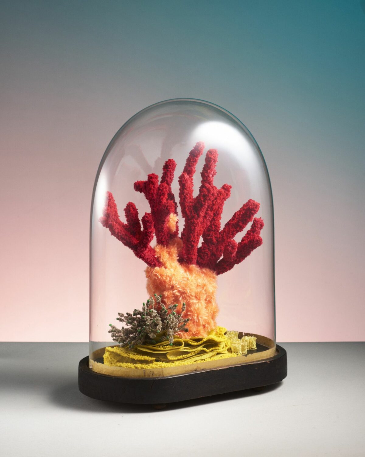Aude Bourgine’s “Lungs of the Ocean” series is a mesmerizing tribute to the breathtaking beauty and fragile existence of coral reefs. Through her intricate embroidered coral sculptures, Bourgine captures the astonishing diversity found within these vibrant marine ecosystems. Each piece is meticulously handcrafted, embodying the patience and precision akin to fine jewelry making. By preserving her creations under glass domes, Bourgine crafts a poignant narrative, echoing the specimens displayed in Natural History museums. These glass-enclosed sculptures not only encapsulate the visual splendor of the coral species they represent but also serve as reminders of the urgent need to protect our oceans. The glass domes act as both shield and showcase, emphasizing both the beauty and vulnerability of these vital oceanic communities.