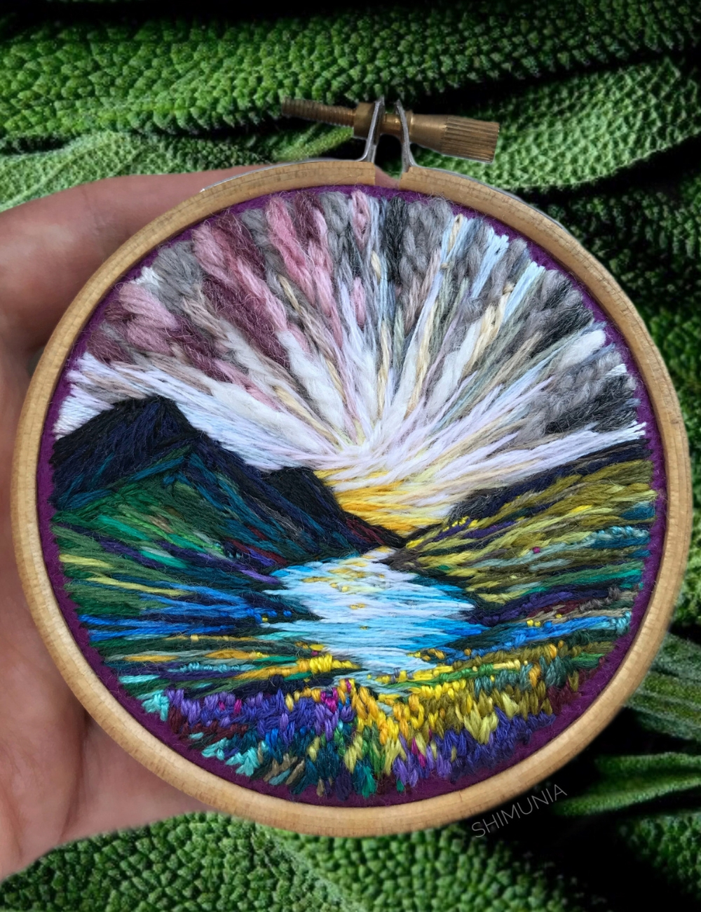 Shimunia draws inspiration from the natural world, translating its grandeur into the compact space of an embroidery hoop. Her pieces are not just visually appealing; they are a testament to the artist’s skill in using thread and needle to weave together scenes that feel both fantastical and true to life.